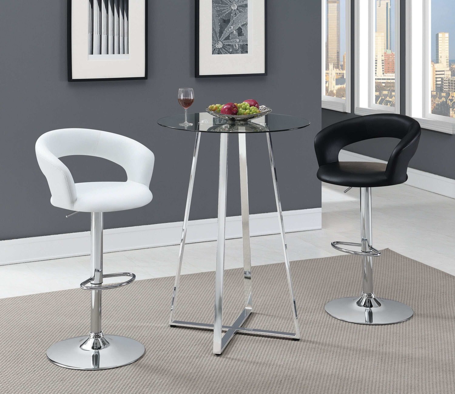 - Height adjustable hydraulic bar stool available in white, black, and grey leatherette
