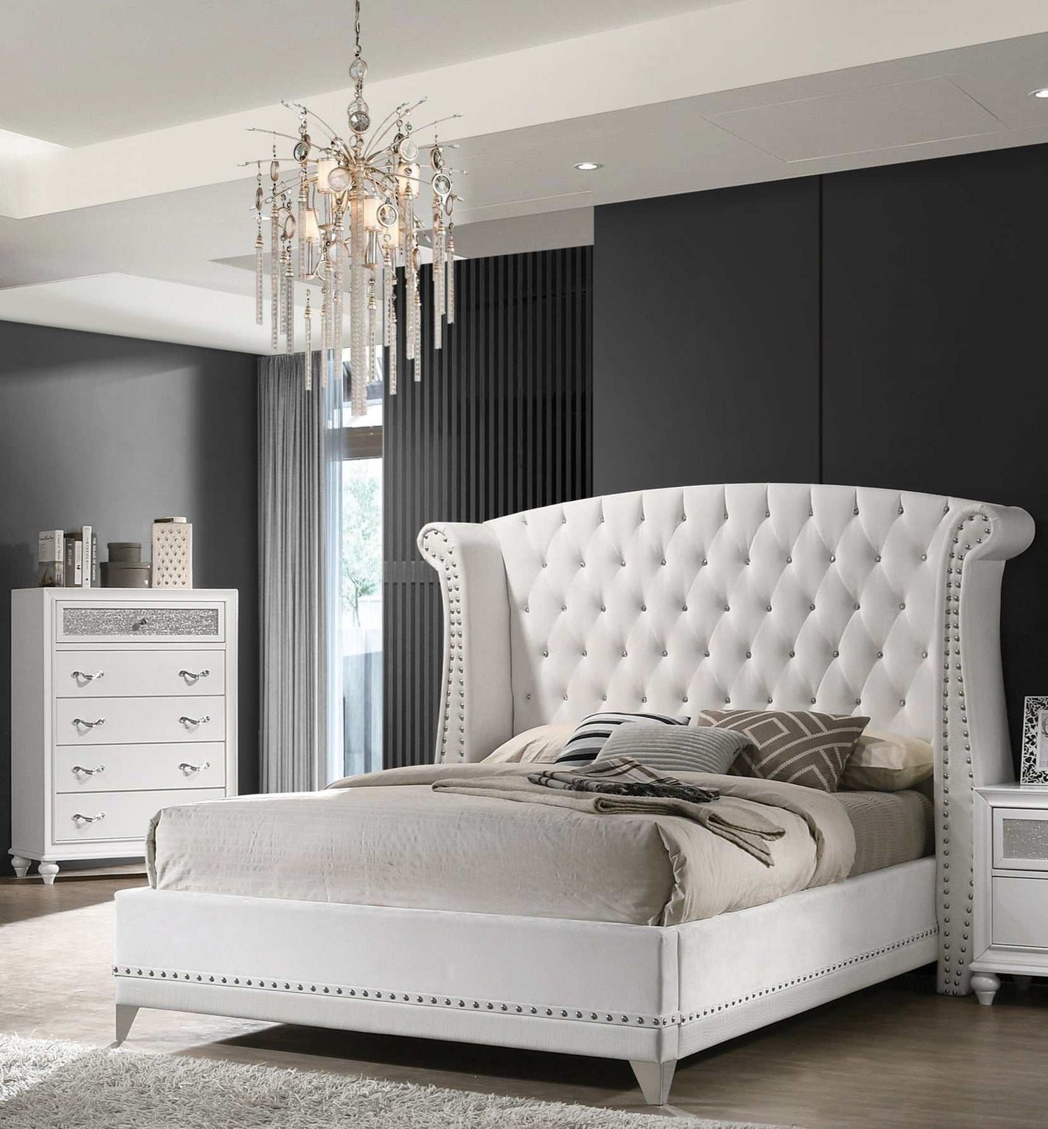 - Extra tall headboard detailed with beautiful crystal button tufting