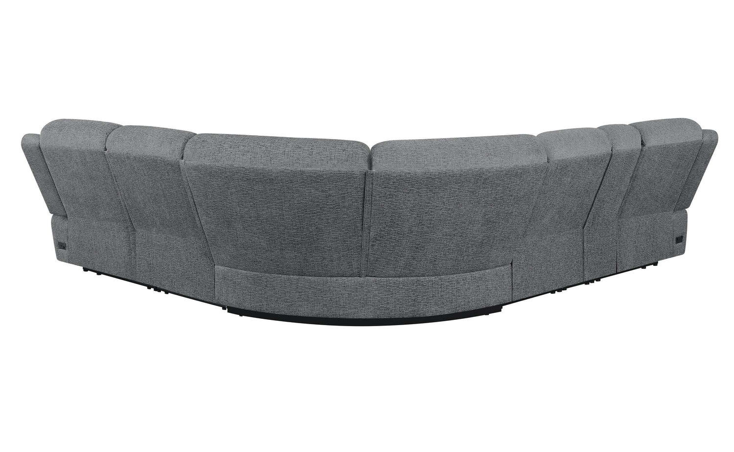 - Six-piece modular motion sectional upholstered in charcoal performance chenille