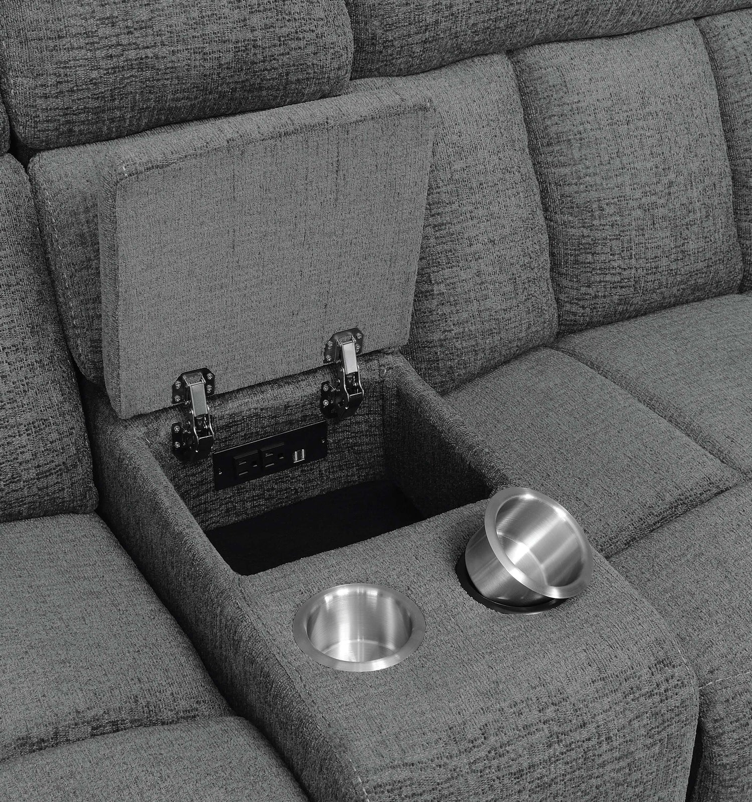 The perfect addition to an entertainment room or spacious living room, this expansive six-piece modular sectional seats up to five people. Wrapped in a charcoal performance chenille, this sectional is soft to the touch. With manual recline options, this furniture piece features three wall-hugging reclining seats. For added convenience, there is a single lift-top console for extra storage, as well as two stainless steel cup holders for keeping refreshments close at a hand. Beneath the upholstery is supportive pocket coils and a cool gel memory foam topper.