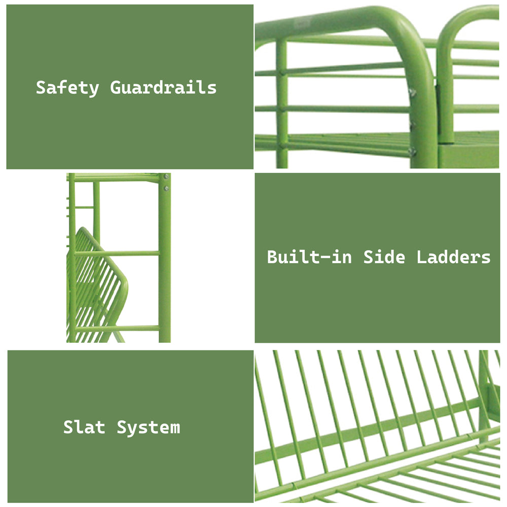 - Twin/Full/Futon Bunk Bed - Slat System Included - Built-in Side Ladders - Full Length Guard-Rail - 2" Metal Tube frame - Optional Colors - Mattress Not Included - Assembly Required