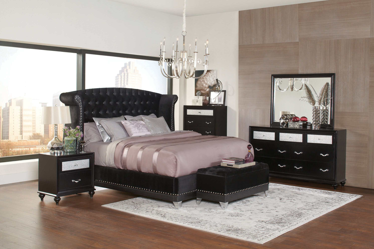 This magnificent bed is designed for sleeping in comfort and style. Headboard is constructed with button tufting and a wingback design that warmly embraces you. Bed is wrapped in sumptuous black with contrasting nailhead trim throughout. It's a bed fit for a regal setting. Note: a box spring is required for this majestic bed.
