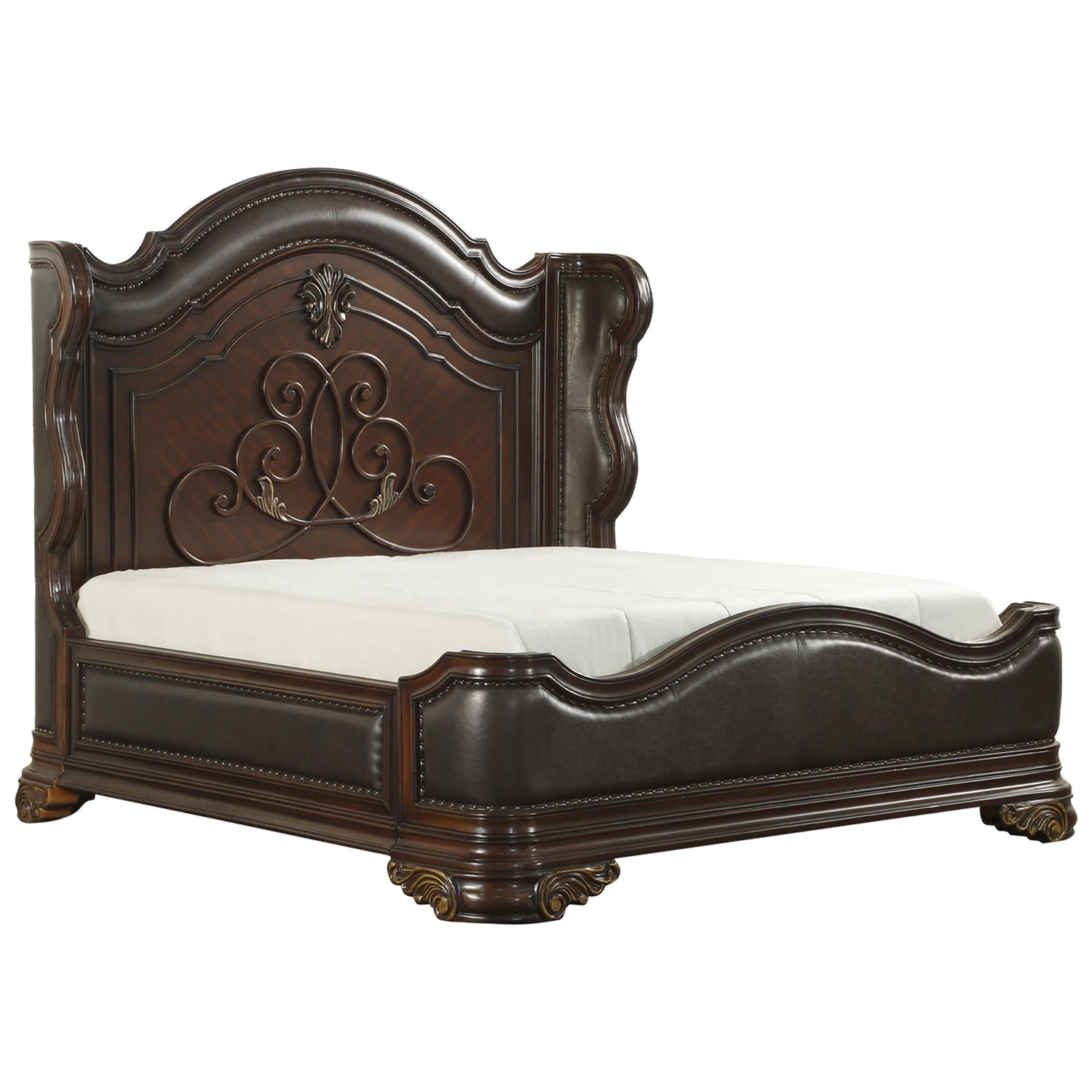 Grandly styled for the traditional home is the Royal Highlands Collection. Prominent decorative scrolling adorns the headboard while heavier, carved scrolling accents the pilasters and feet of each piece in the collection. The substantial wood framing of the bed creates a distinct serpentine profile that carries into the design of the case pieces. Brown faux leather provides complementing contrast to the rich cherry finish. Traditional cherry and birch veneers accenting furthers the elegant presentation of the Royal Highlands Collection.