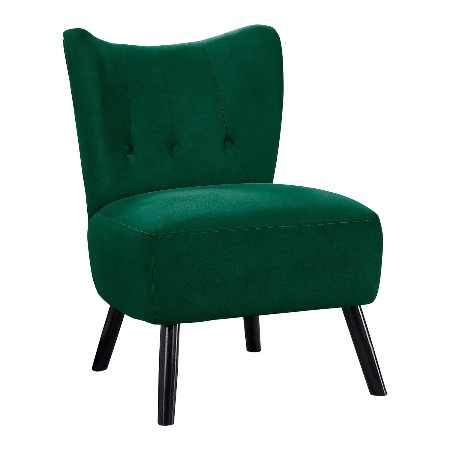 Fun and funky, the Imani Collection will add vibrant accent to your home’s modern décor. The bold green velvet covering of this retro-inspired accent chair is sure to draw attention. Dark brown finished wood legs, button accent and contoured shape lend to the unique styling of the collection. Also available in gray, red, yellow and orange velvet coverings.