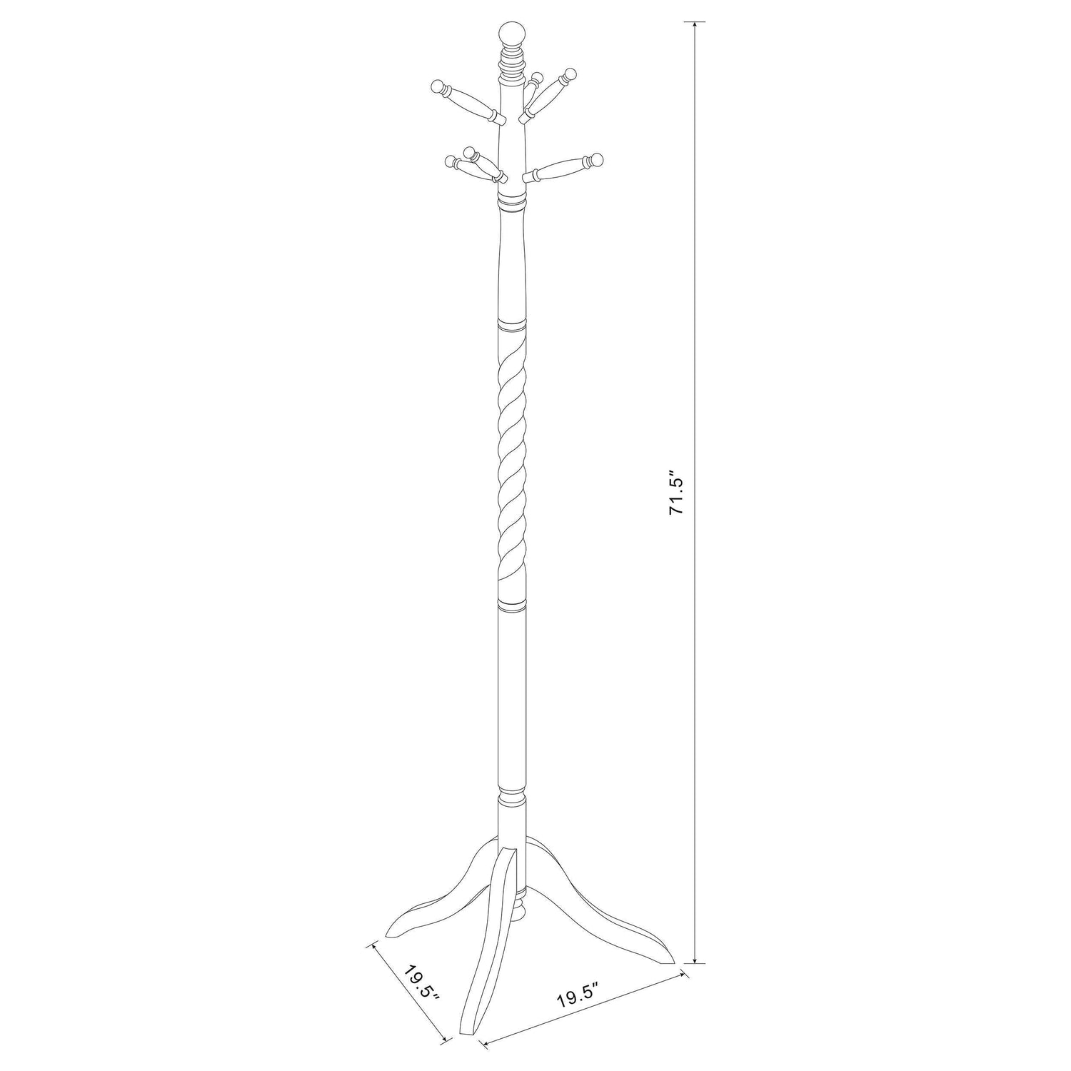 Great next to an entryway, this traditional coat rack offers a welcoming feel. The warm merlot finish complements classic design while adding structure to a space. Intricate and eye-catching, the center of the silhouette features a twist design. Complete with two tiers of coat hangers, this coat rack is perfect for the dinner party host. Hang purses and jackets in style with the tripod-inspired base.