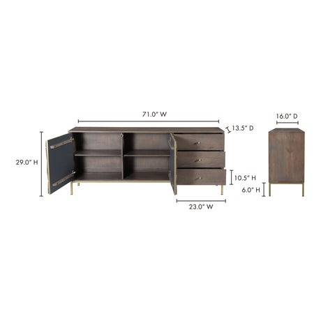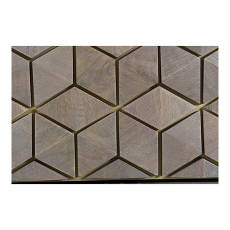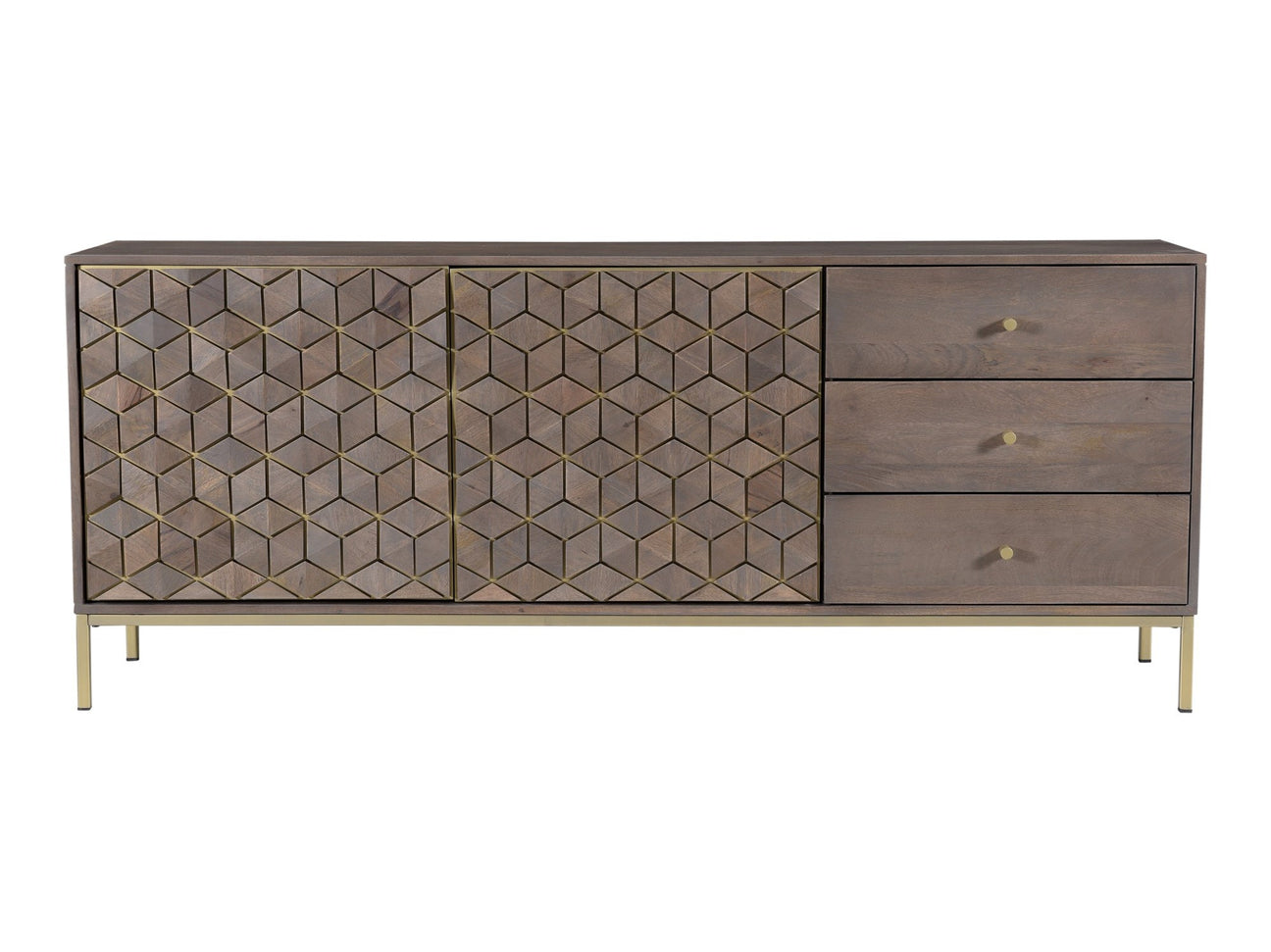 - - Beautiful cubic patterns and a brass metal finish is present on the Corolla sideboard. Produced with ethically sustainable mango wood, this buffet is durable and long lasting. The multiple drawers and large storage space make the Corolla sideboard the perfect functional piece for the dining room.