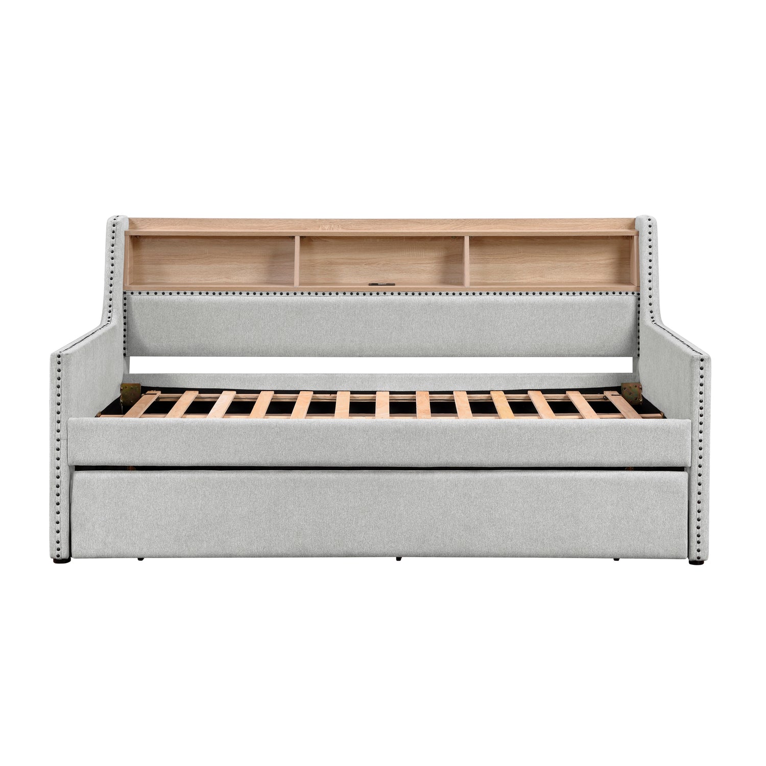 Maximize your space and style with this versatile twin daybed, featuring a convenient pull-out trundle, integrated bookcase, and built-in power outlets with charging ports. Upholstered in a sophisticated textured fabric and accented with elegant nailhead trim, this daybed seamlessly blends functionality with modern design. Perfect for guest rooms, home offices, or kids' spaces, it offers comfortable sleeping for two without the need for a box spring. The engineered wood frame ensures durability, while the integrated charging station keeps devices powered and within reach. Assembly is required, but the transformation of your space into a multifunctional haven is well worth it.