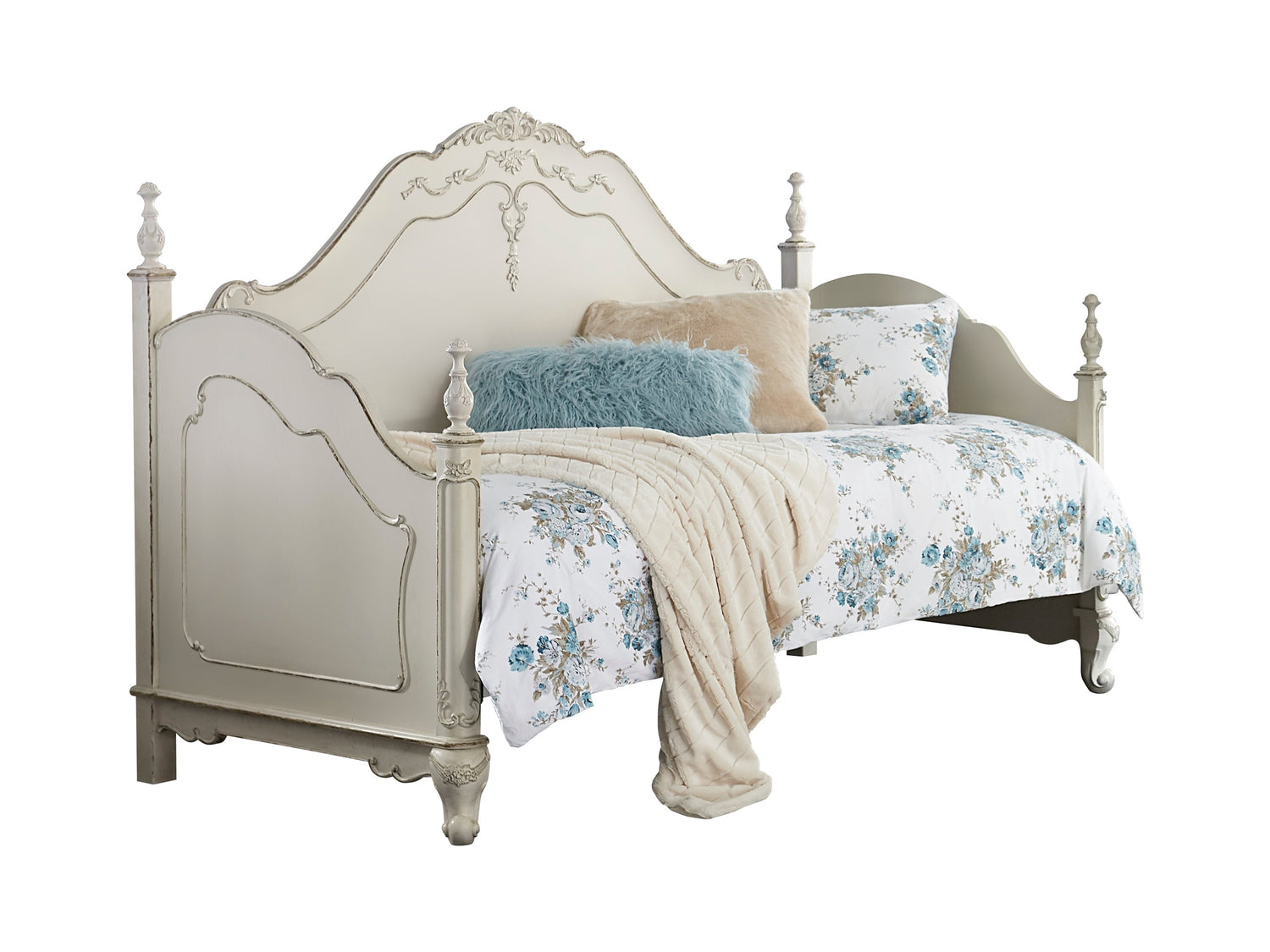 The Cinderella Collection is your little child’s dream come true. The Victorian styling incorporates traditional floral motif carving details on the white with gray rub-through finished twin daybed that will create the feeling of stepping into a fairy tale. Carved finials top the corner posts of each post further lending to the classic look. Chest, dresser, mirror, nightstand, TV armoire, lingerie chest, desk, hutch, desk chair, twin canopy poster bed, twin trundle, full canopy poster bed, twin bed, full bed and queen bed are also available. Link spring is not included.