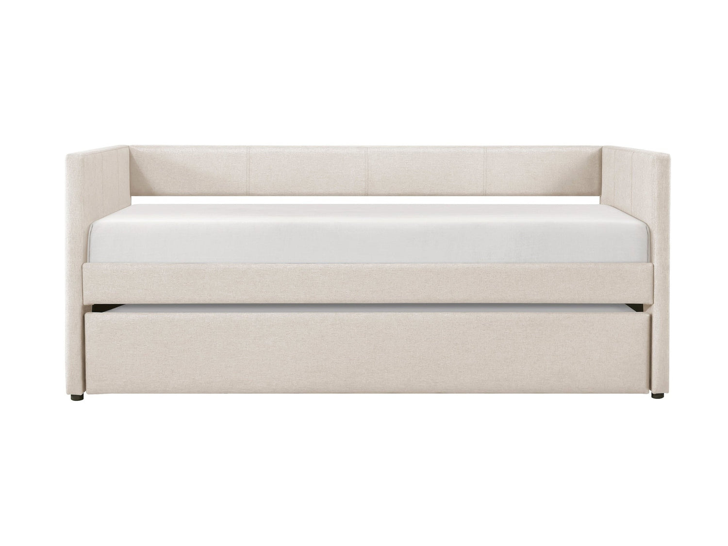Whether tucking in for the night or lounging while reading a good book, the Trudy Collection is a versatile option for your bedroom space. The modern lines of the daybed lend to myriad decorative aesthetics ranging from Modern to Transitional while the Beige hue of the fabric upholstery provides further complement to your space. The additional sleep space the included trundle can provide for your home allows for convenient access when it is needed and discrete storage when it is not in use.
