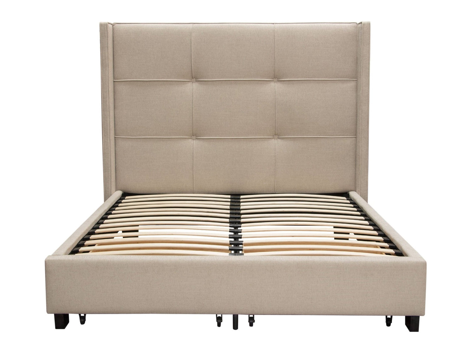 - Finished in a soft sand fabric, the Beverly Bed also features an integrated pull.