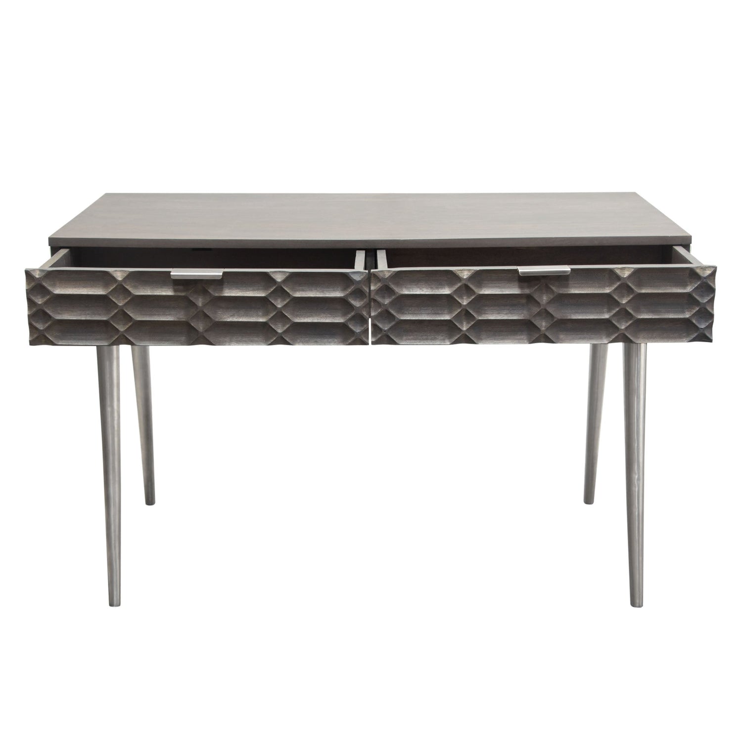 - Solid Mango Wood in Smoke Grey finish with Nickel finished Iron Legs & Drawer Pulls provide a chic and sophisticated aesthetic.