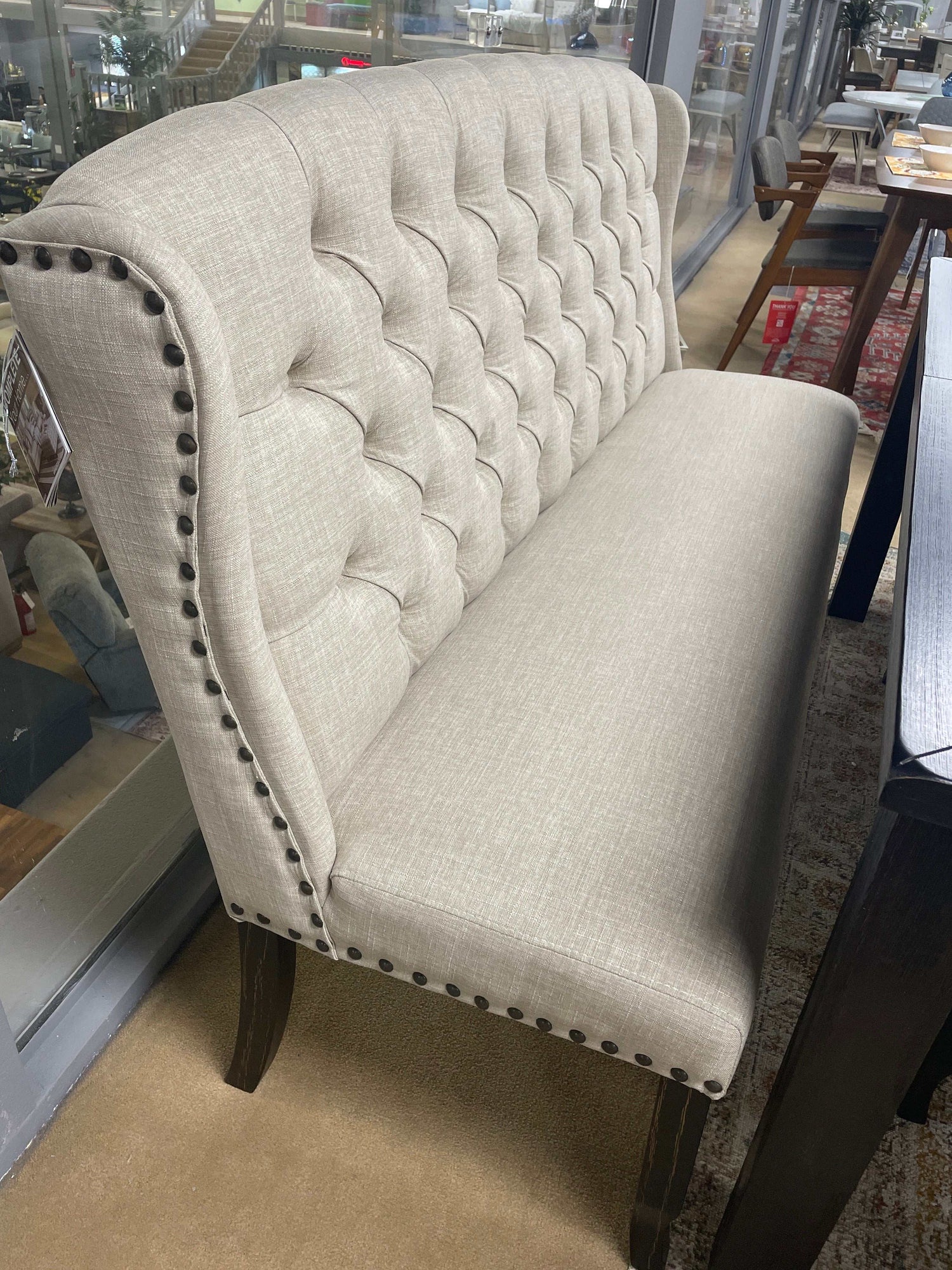 Rustic charm meets upscale design in the form of this stunning collection. This elegant linen-like 3-seat love seat bench add sophisticated appeal with its wingback sides, button tufting and nailhead trim.