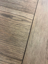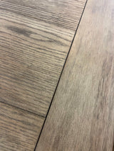 Set your sights on this dining set. The rectangular table, with six drawers for storing away smaller items, beautifully suits your storage needs. Its timeworn planked oak top creates a unique two-tone contrast, while tapered legs feature a sturdy foundation. The heavily textured black and oak finish is trend-right urban farmhouse style. Four solid wood upholstered dining chairs with slat backs complete this winning combination.
