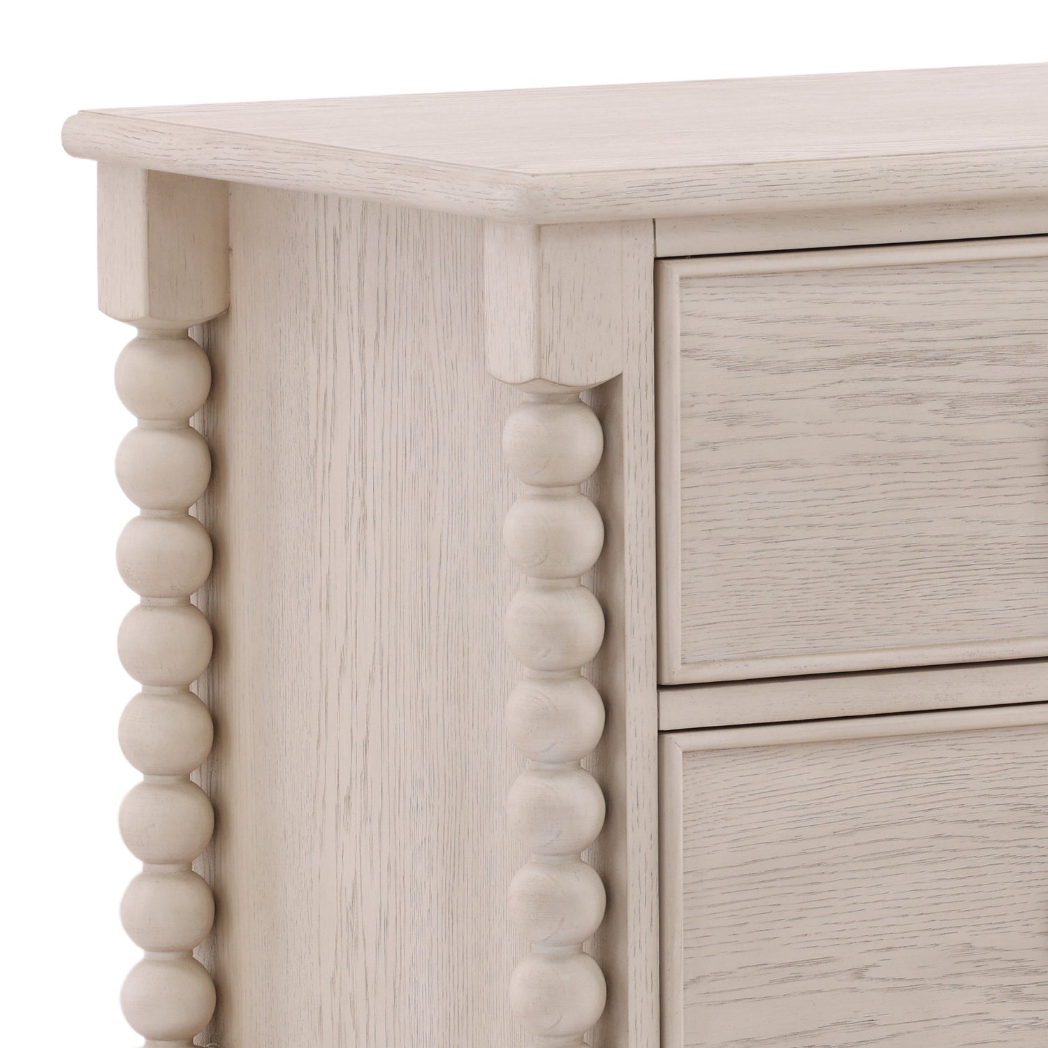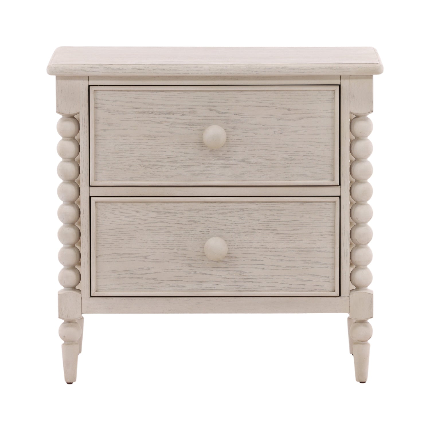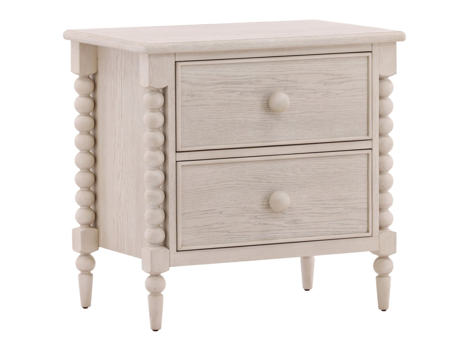 The Marcellina Nightstand is made from rubber wood and oak veneer, featuring a soft whitewash finish. Its elegant design adds a touch of sophistication to any bedroom, while providing ample storage with its drawers. Perfect for creating a serene, modern aesthetic.