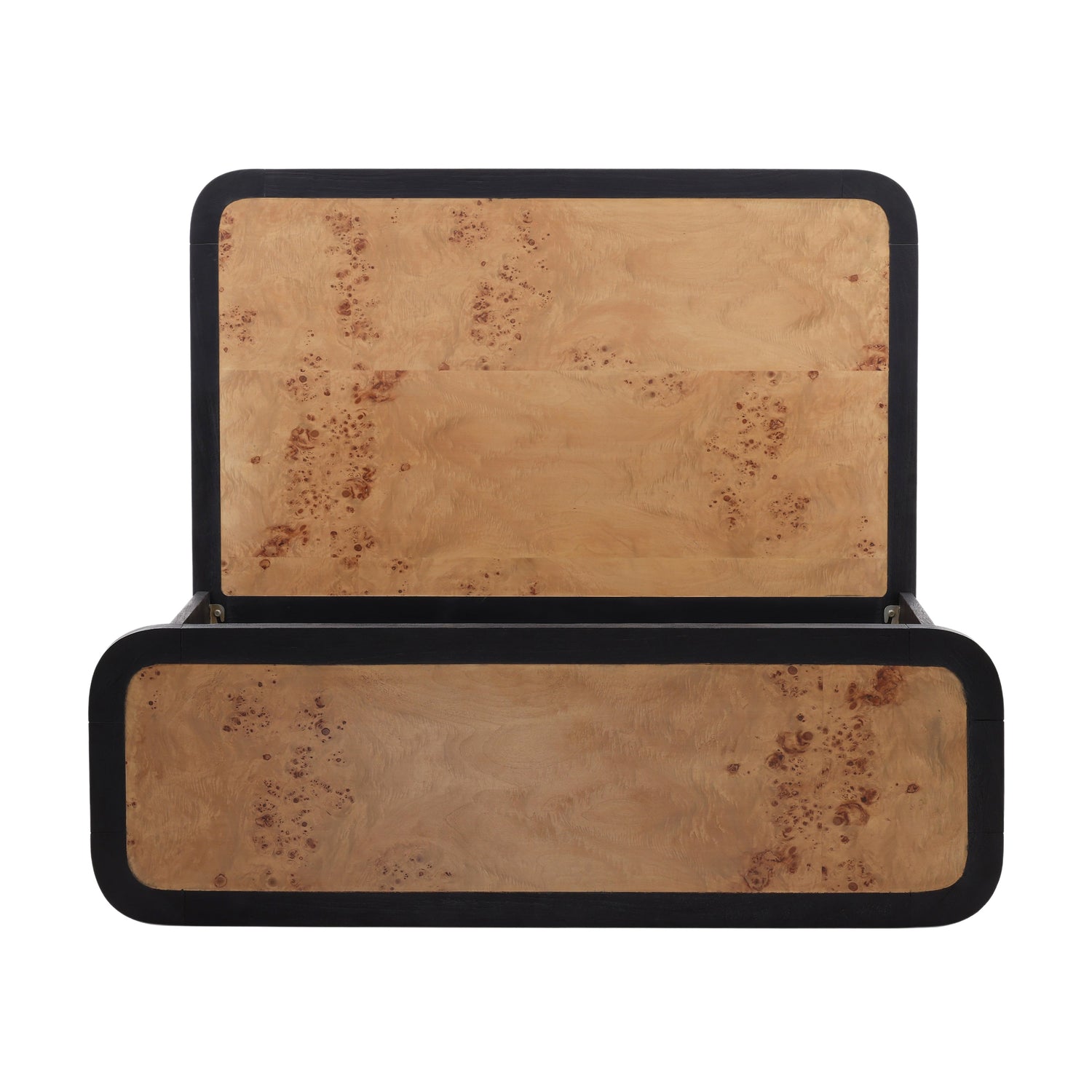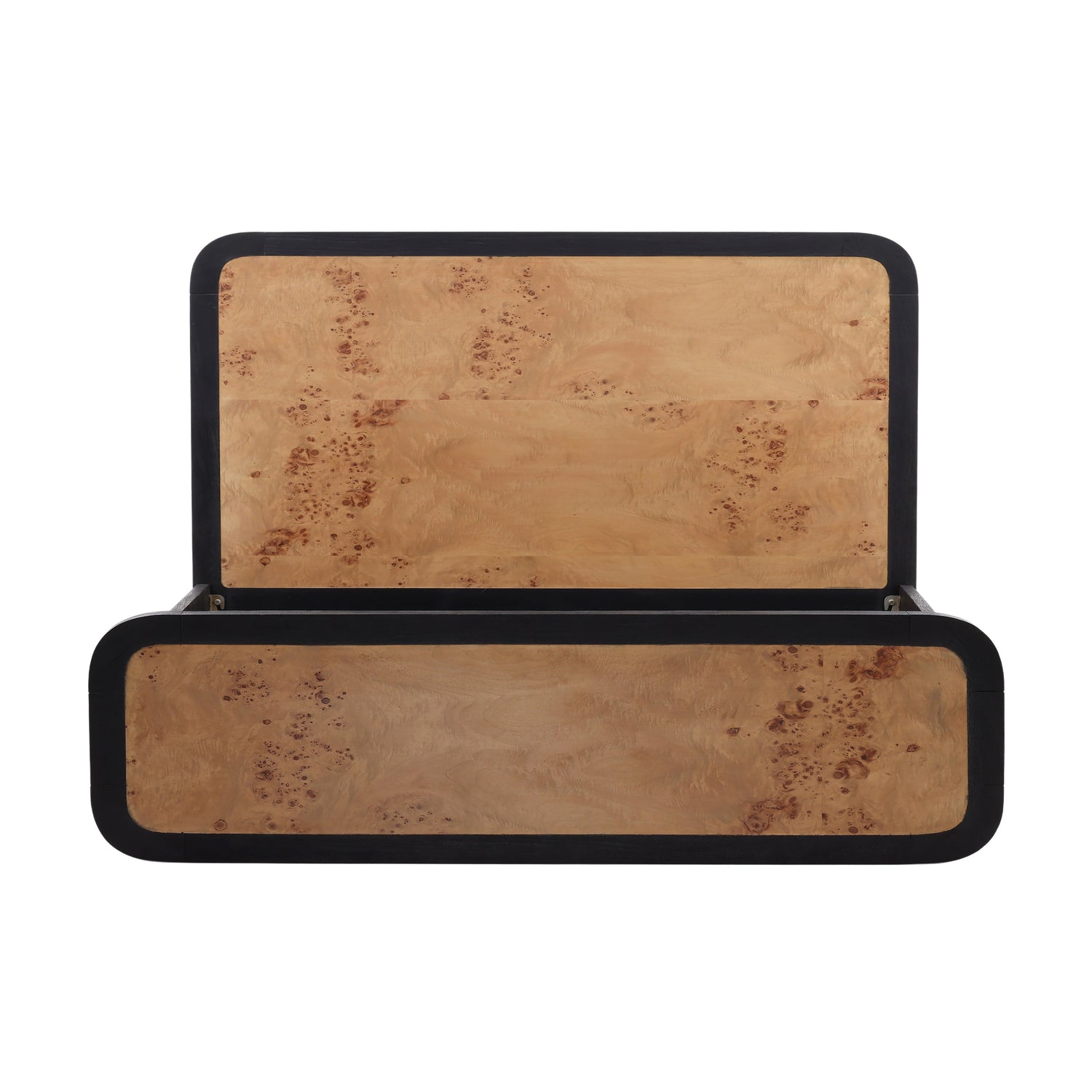The Tanya Bed is made from a combination of Mappa Burl and Acacia Wood, offering a striking contrast between the natural wood and black finish. Its unique design highlights the rich textures of the materials, creating an elegant and modern look. This bed provides both durability and style, making it a perfect centerpiece for any bedroom.