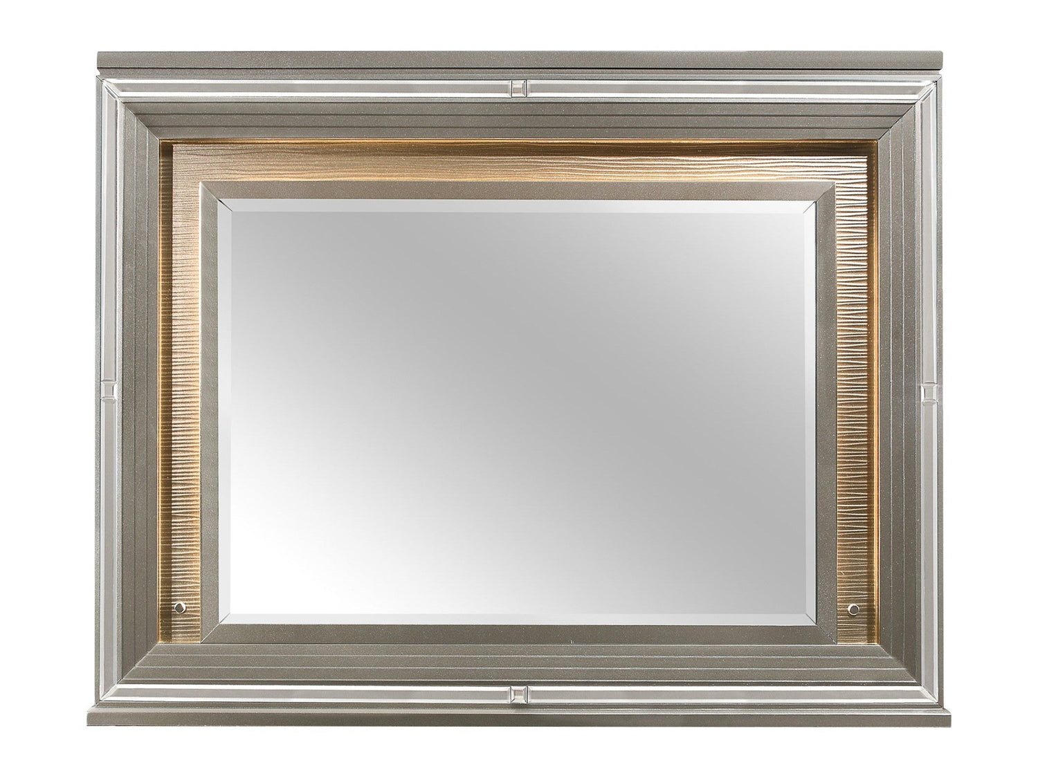 Designed to help your bedroom reach its full glamorous potential, the Tamsin Collection’s unique attributes blend to create a stylish and functional addition to your lifestyle. Mirrored trim provides dramatic enhancement to the mirror frame, while LED back-lighting, from the behind the mirror, illuminates and highlights the silver-gray finish of the collection.