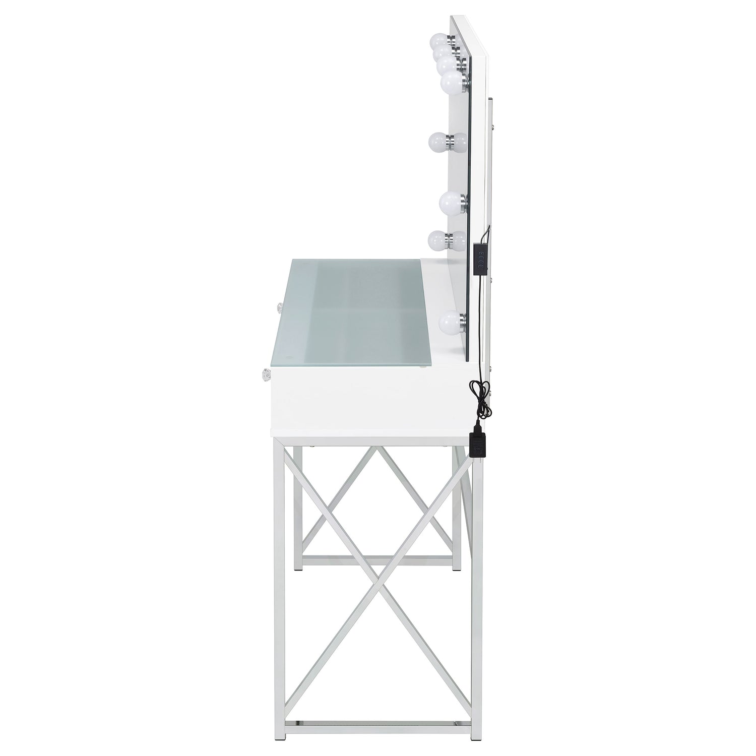 - Includes: One (1) vanity table, one (1) mirror, and one (1) stool- Bright white finish with a large drawer for stashing your daily necessities