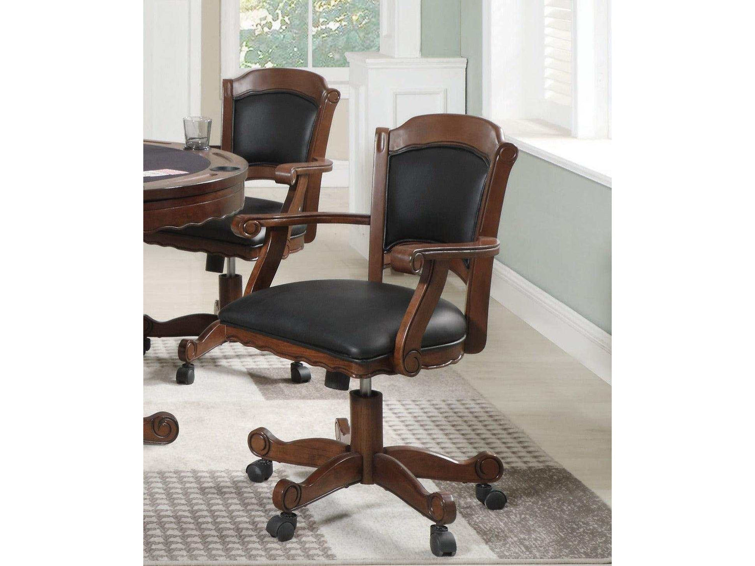 The height of elegance brings romantic character. Dress up an entertainment space with this beautiful game chair. Incredible attention to detail covers all bases with romantic curved accents and scalloped edges. With a tobacco finish and black leatherette seat cover, it extends a versatile and enticing look. Caster wheels aid in movement for game night.