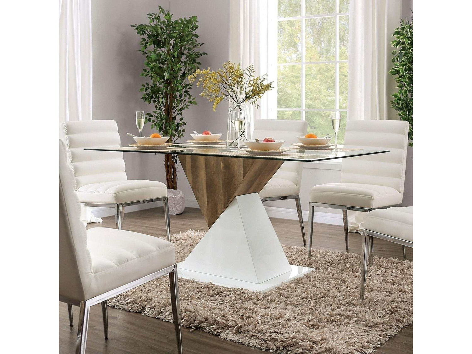 The table in this contemporary set features a tempered glass top with a beveled edge and a unique, geometric pedestal base with a striking two-tone finish to give your dining room an instant focal point. Combined with plush cushioned faux leather dining chairs to keep guests resting comfortably.