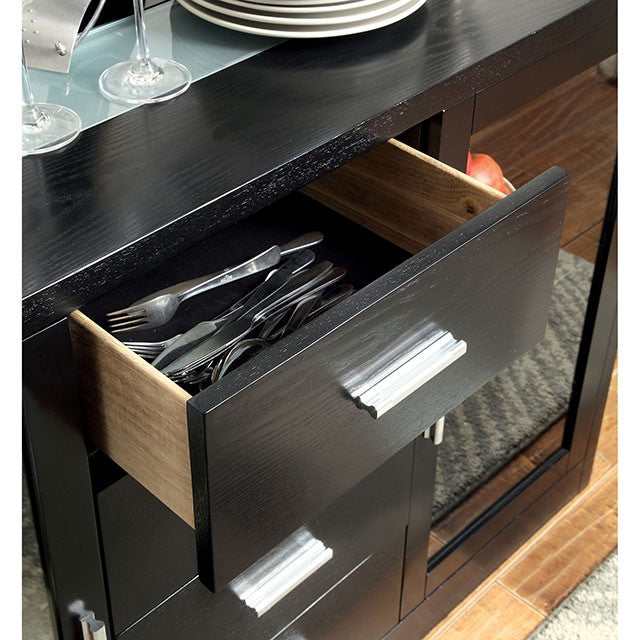 Combine ambience with appetite in this extraordinary dining set. LED lights are embedded underneath the frosted tempered glass insert of the table and the matching server. With three levels of brightness, there will always be a perfect mood for the perfect moment.