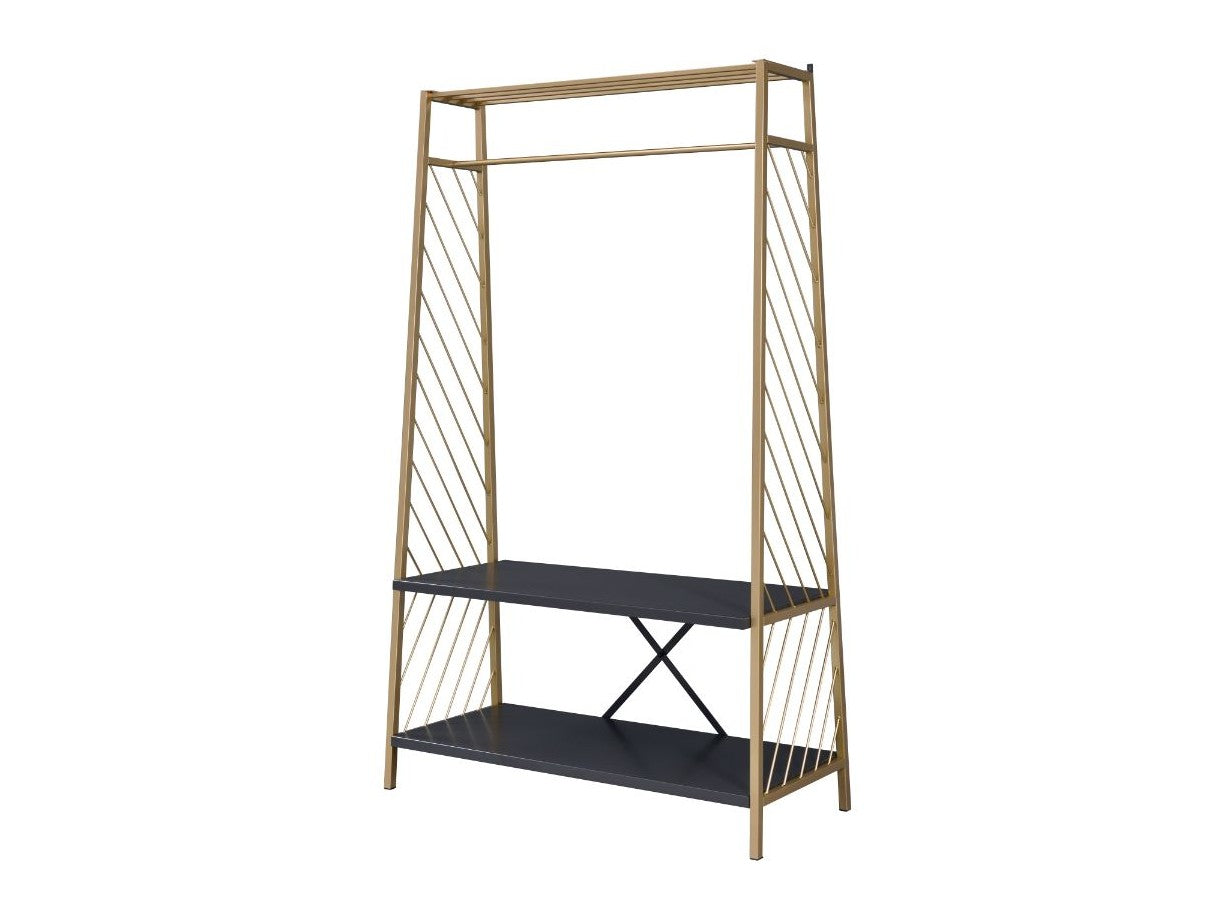 Inspired by contemporary line art, the hall tree showcases a open frame with clean lines that enhances the fashion sense of the space. A gold finish beautifully complements the metal frame while it's shelves in a deep black finish highlight your collections. There are two tier shelves and a hanging rail that allow your to showcase your personal'style.