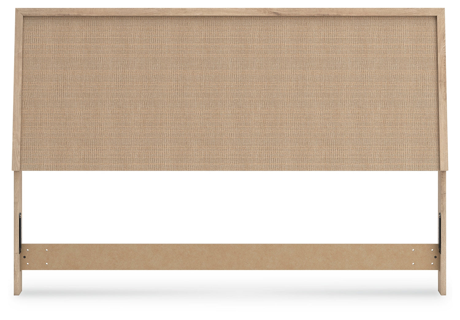 Clean-lined and contemporary—but far from stark—this king panel headboard is a fresh style awakening. Pairing a light finish with replicated oak grain and textured beige cane details, its mixed materials bring a naturally versatile vibe to your bedroom. Talk about style with added dimension. Its simplicity plays perfectly with the modern aesthetic and is the stuff dreams are made of.