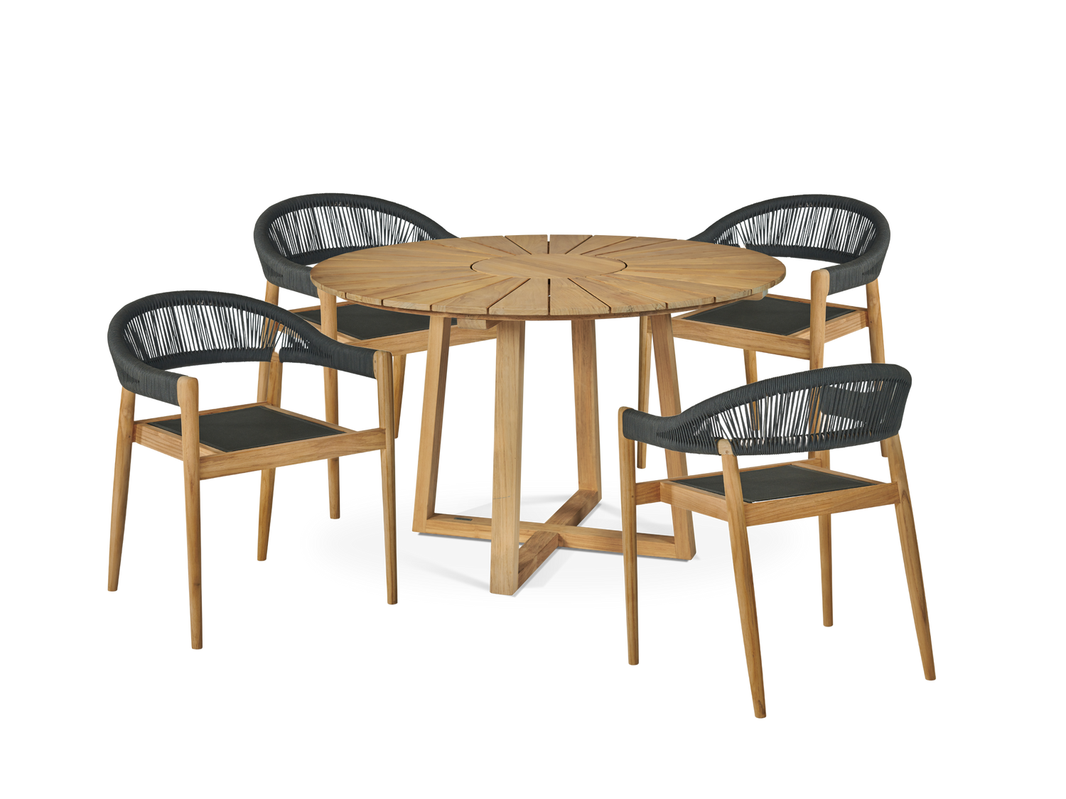- Item Name: Cambria 5-Piece Round Teak Black Outdoor Dining Set with Stacking Armchairs