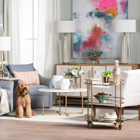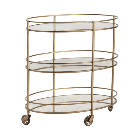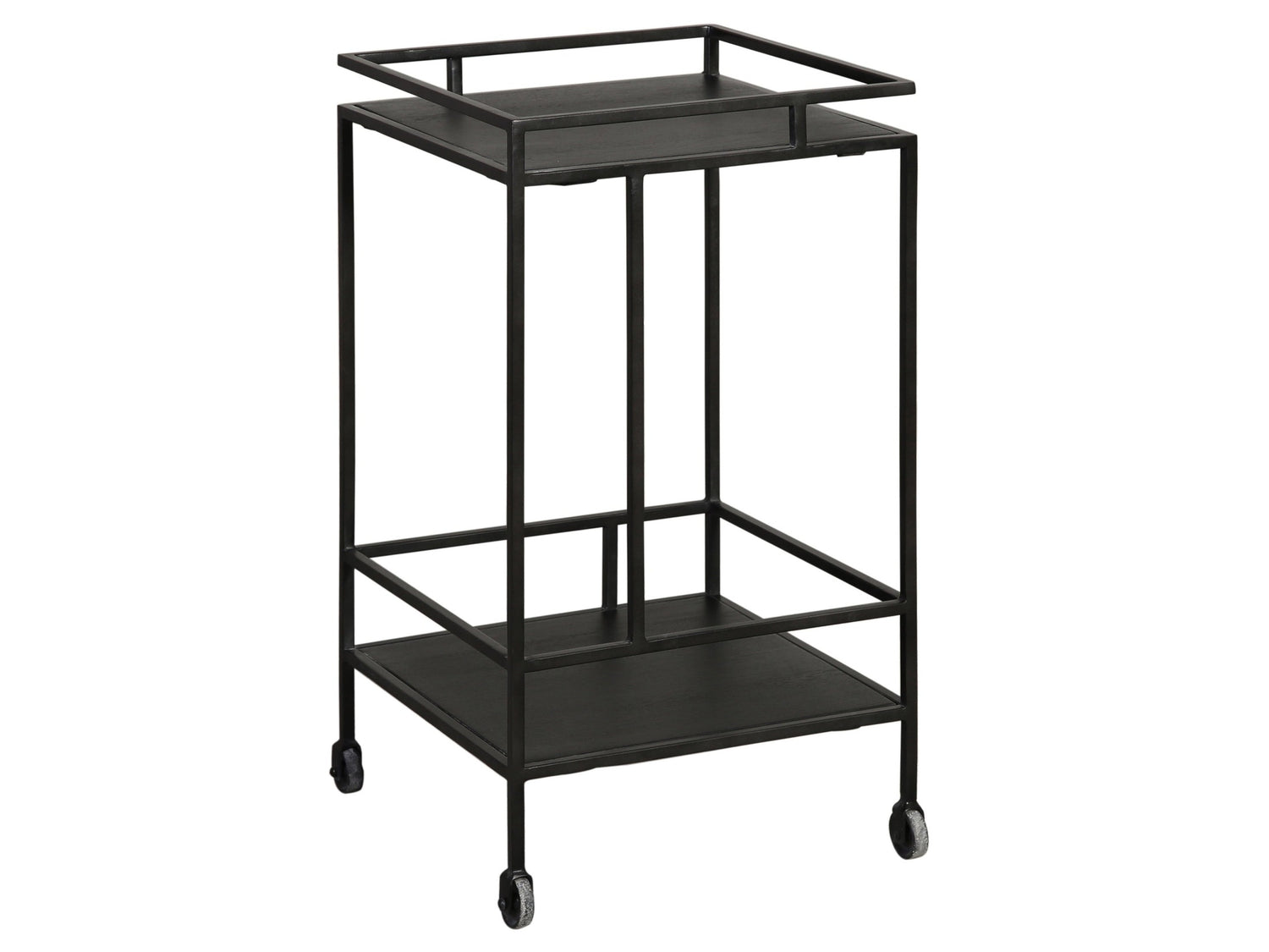 The Evita Bar Cart blends modern elegance with functionality, featuring a sleek iron frame and oak wood shelves for a sturdy, stylish design. Its black finish complements any decor, making it the perfect addition to serve drinks in style. This versatile cart is ideal for both home entertaining and practical storage.