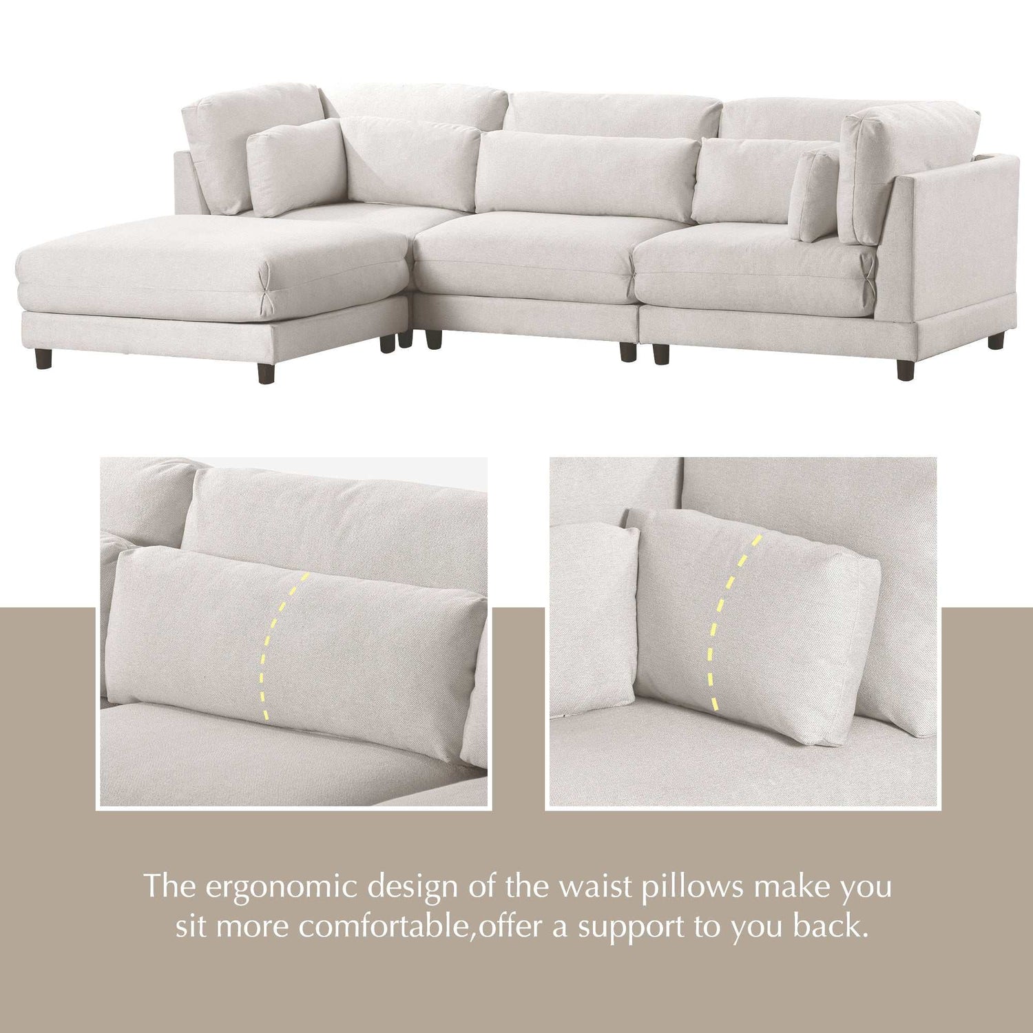 Comfort is prioritized with low arms, nine cushions, and four waist pillows providing ample padding. The stylish feet and neutral color scheme seamlessly integrate with any decor style. For added versatility, a square ottoman with a cushioned top can be tucked against the sofa to create a chaise. Upgrade your living space with this spacious and inviting sectional ensemble, perfect for movie nights, game days, or relaxed get-togethers.