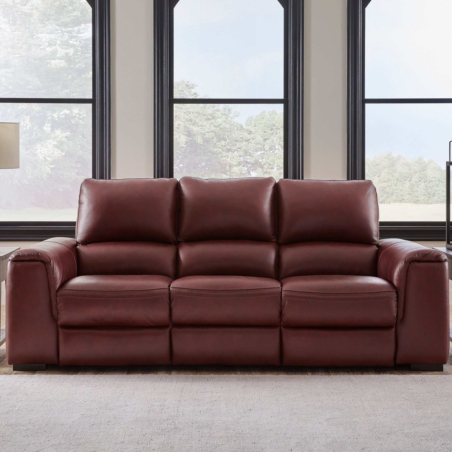 Impressive in scale while keeping an air of refinement, this power reclining package stuns with soft, supple leather match upholstery in garnet. Sink into real leather in the seating areas and inside backs while catering to your comfort with one-touch power reclining and adjustable headrests. Complete with USB charging, this set makes a surefire statement in your contemporary living room.