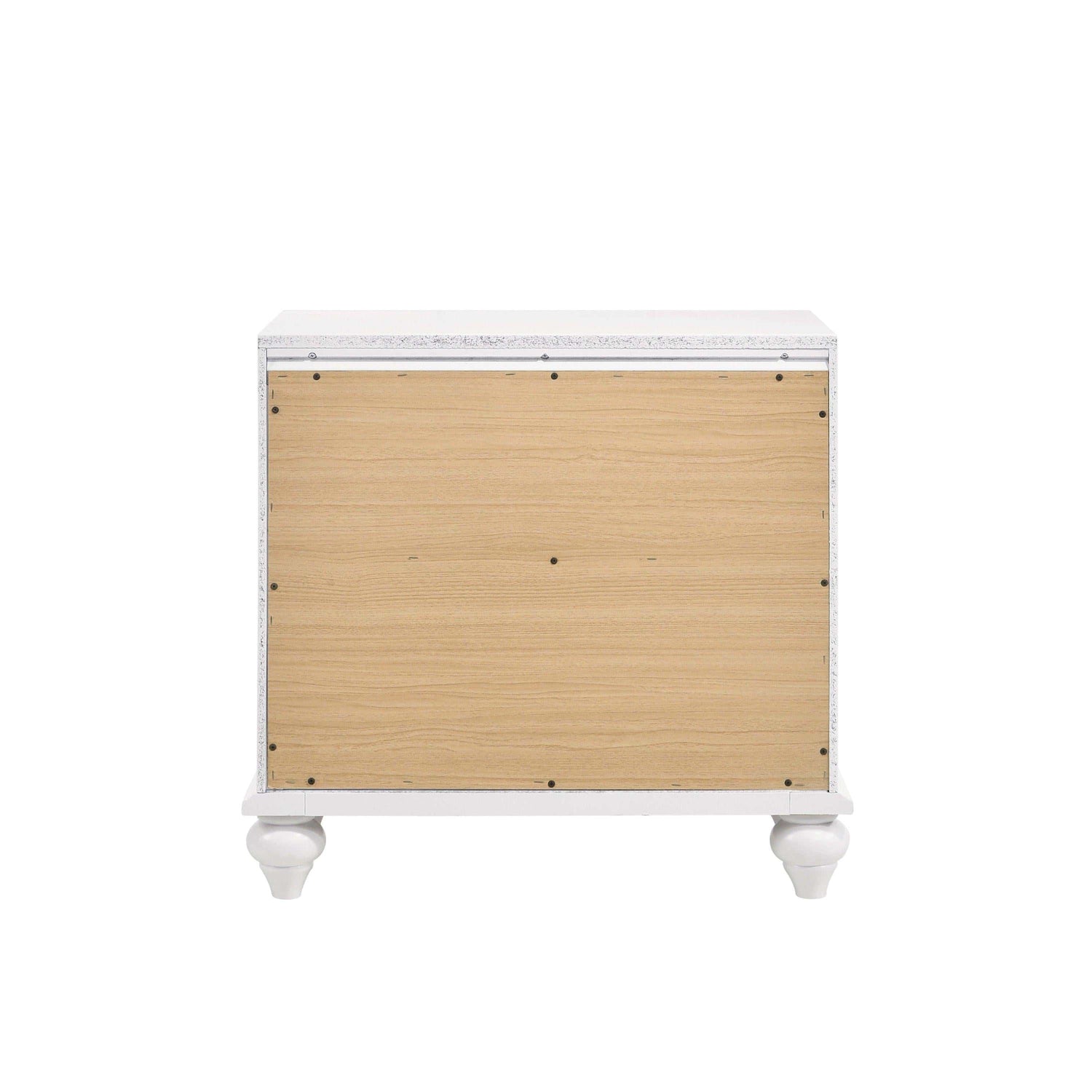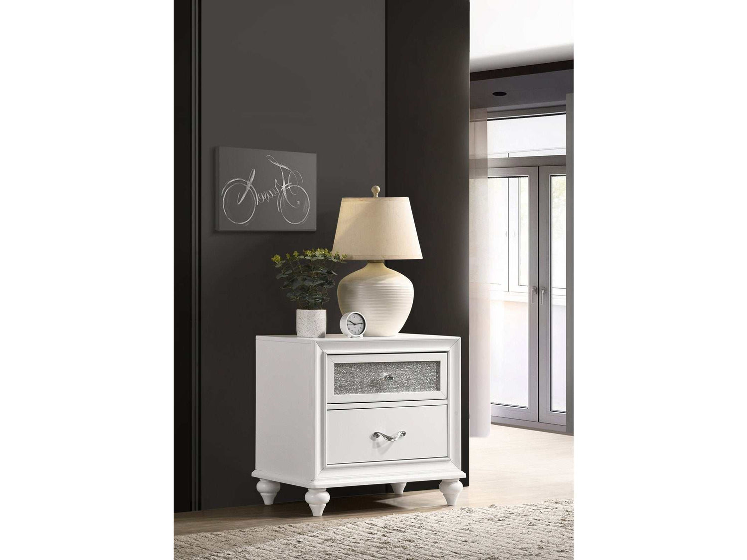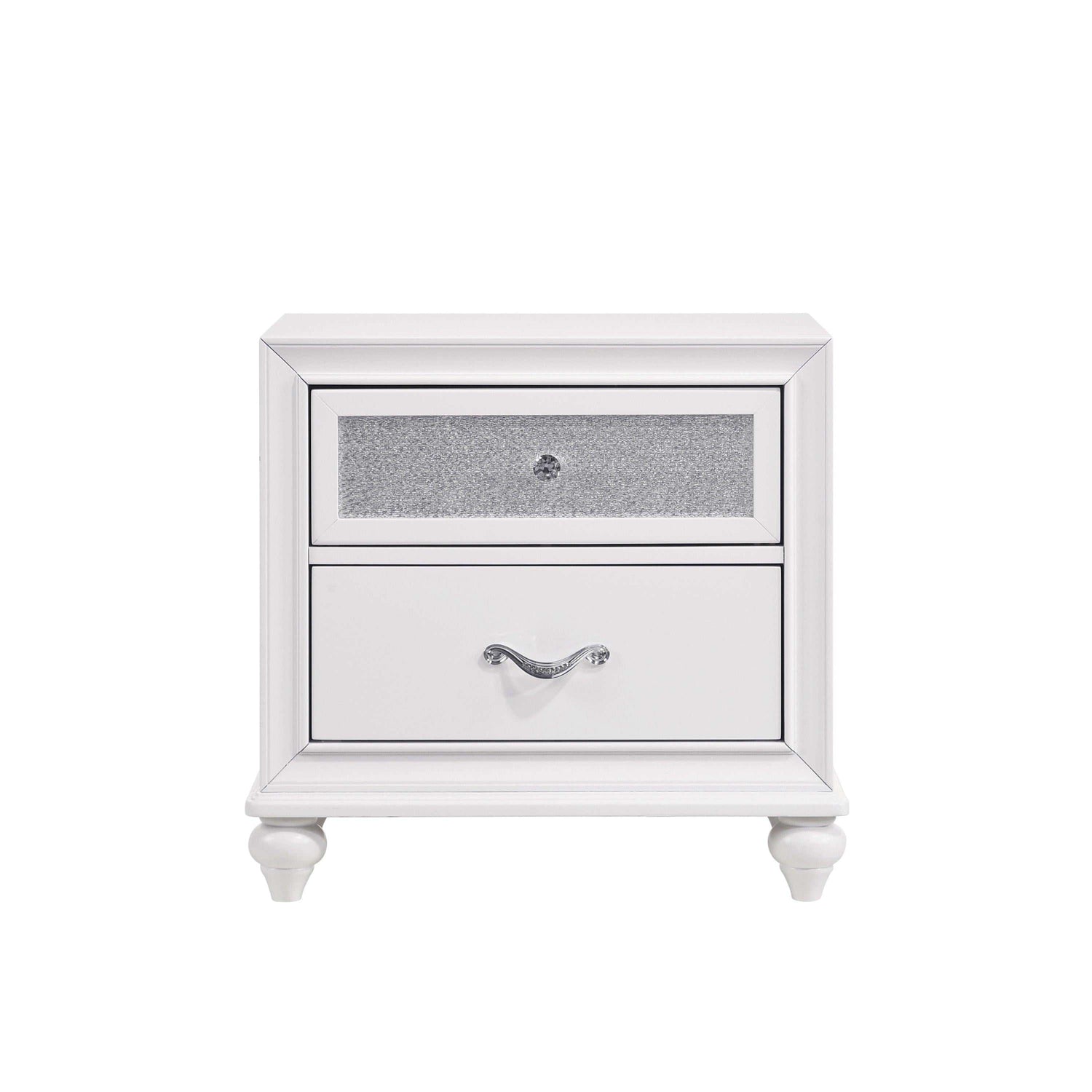 Bring a bit of glam and glitz into your personal space. This gorgeous, white nightstand is embellished with touches of sparkle to add a pop of pizzazz to any bedroom.The faceted crystal hardware glistens and gleams. The glittery acrylic panels sparkle and shine against the clean, classic white finish. Equipped with two drawers for your storage convenience, this stunning, modern nightstand keeps a bedside organized in style.