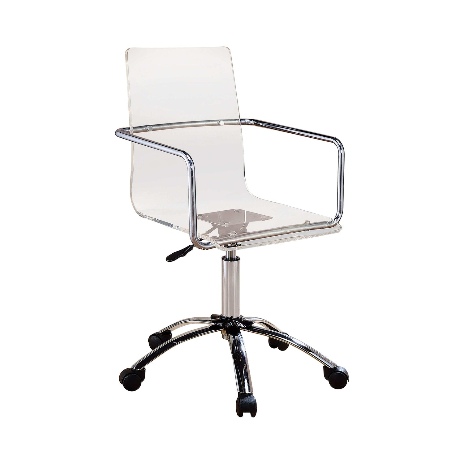 The office of the future is here today. Stylize a home or business workspace with a cutting edge chair. A molded seat and back crafted from clear acrylic add a breathtaking effect that energizes any room. Chromed steel constructs a solid base with caster wheels for optimal movement. Adjust seating positions to meet your needs and make this ultra-contemporary office chair a keeper.