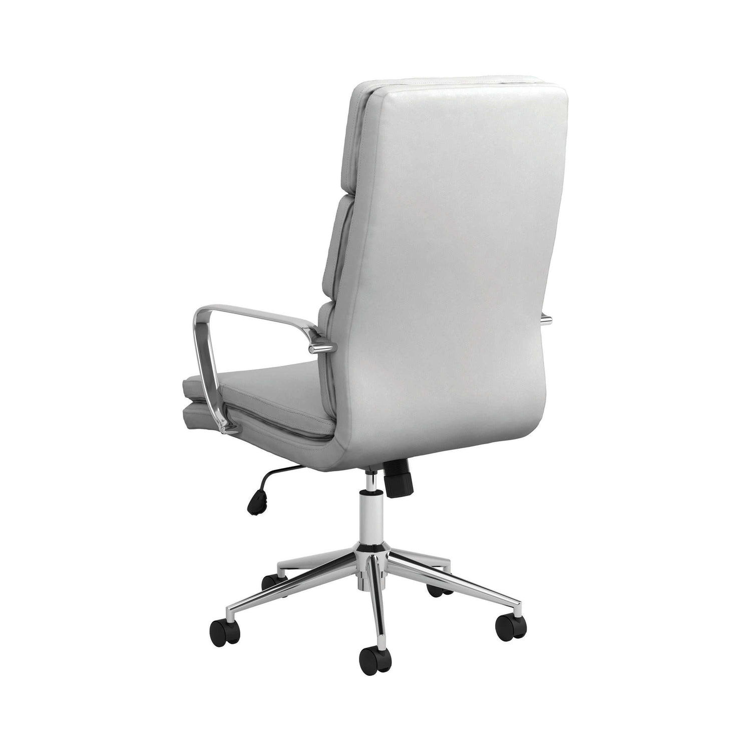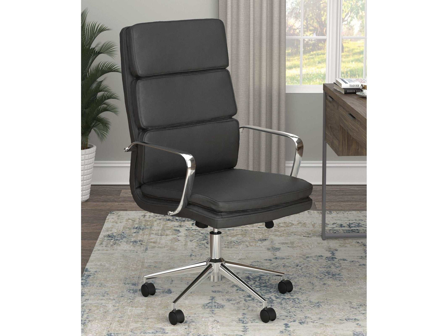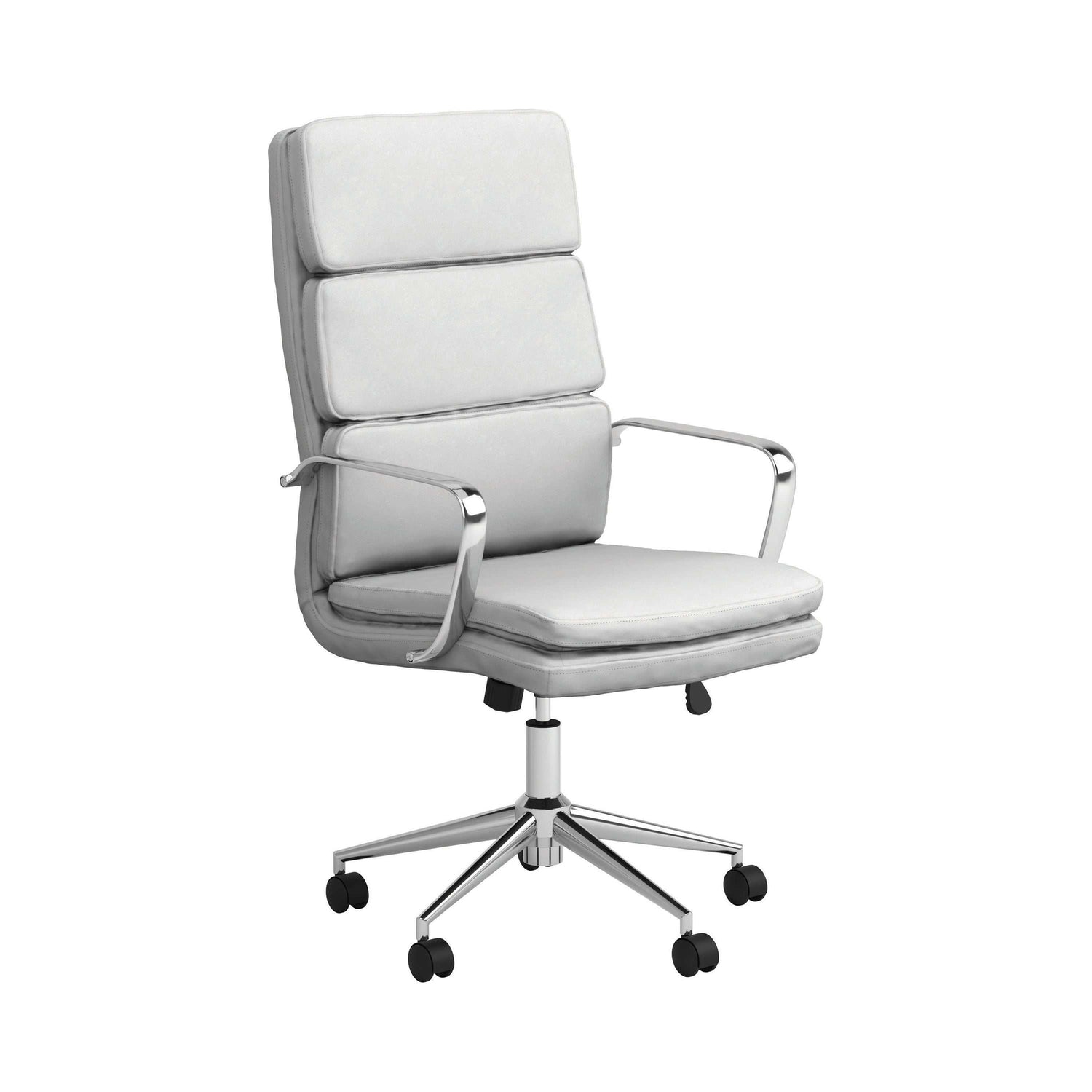 Update your workspace with this modern office chair. A chrome finish on the chair base and contoured arms are a modern touch as is the horizontal stitching on the seat back. This cushioned office chair features an ergonomically contoured back for ideal support and comfort, with armrests for added stability. This height-adjustable office chair comes with casters for easy mobility. Available in your choice of leatherette upholstery colors to suit the look of your office.