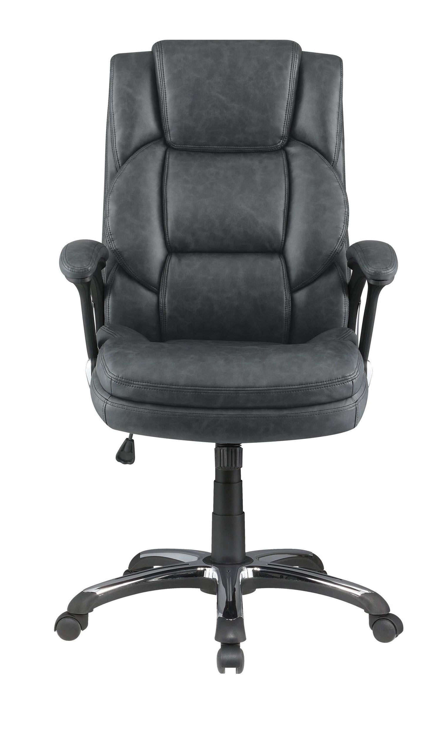 Perfect for a home office, this office chair features plush seating and headrest for working long hours. Wrapped in a supple leatherette, this chair also offers ergonomic design with curved, padded armrests. Get around the office easily with five chrome caster wheels. Included with this office chair is an adjustable lever to raise to your existing desk height. Place this office chair in a modern or contemporary home office for ultimate comfort and support.