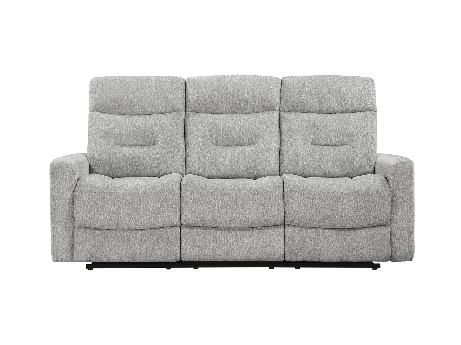 Your comfort is at hand in the design of the Lyndon Collection. The dual reclining ends of the sofa are engaged with a pull of the side-mounted tabs. Gray chenille fabric upholstery covers the plush, subtle modern framing, furthering your comfort, and serving as a neutral palette for your living room décor.