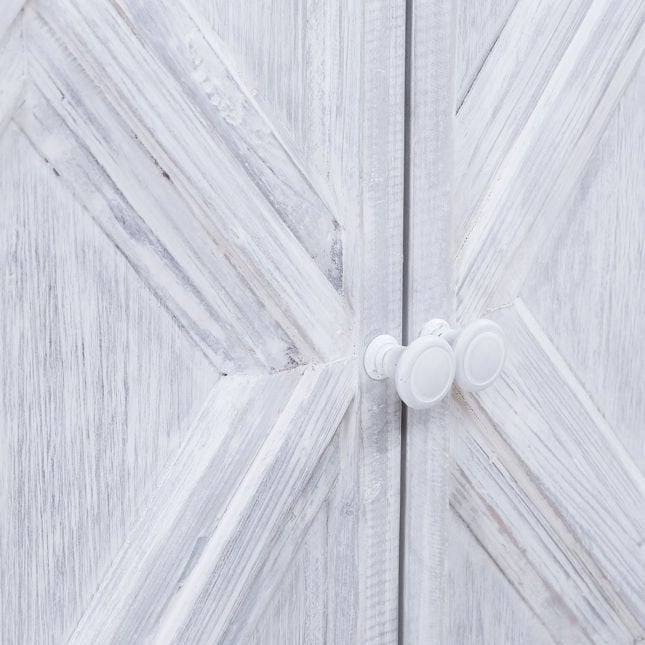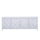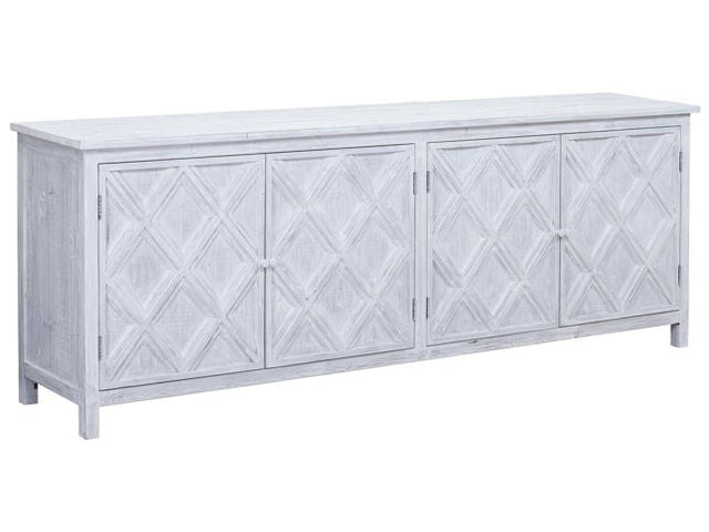 This extra-long sideboard stretches out at 94' in length and made from solid reclaimed Pine hardwood. Finished with a beautiful, whitewashed finish and hand carved door fronts in an elegant and fun crisscross pattern with understated door pulls that open to large storage compartments. Inside are built-in shelves with magnetic closures for a secure close. This piece will add a fun flare to any home.