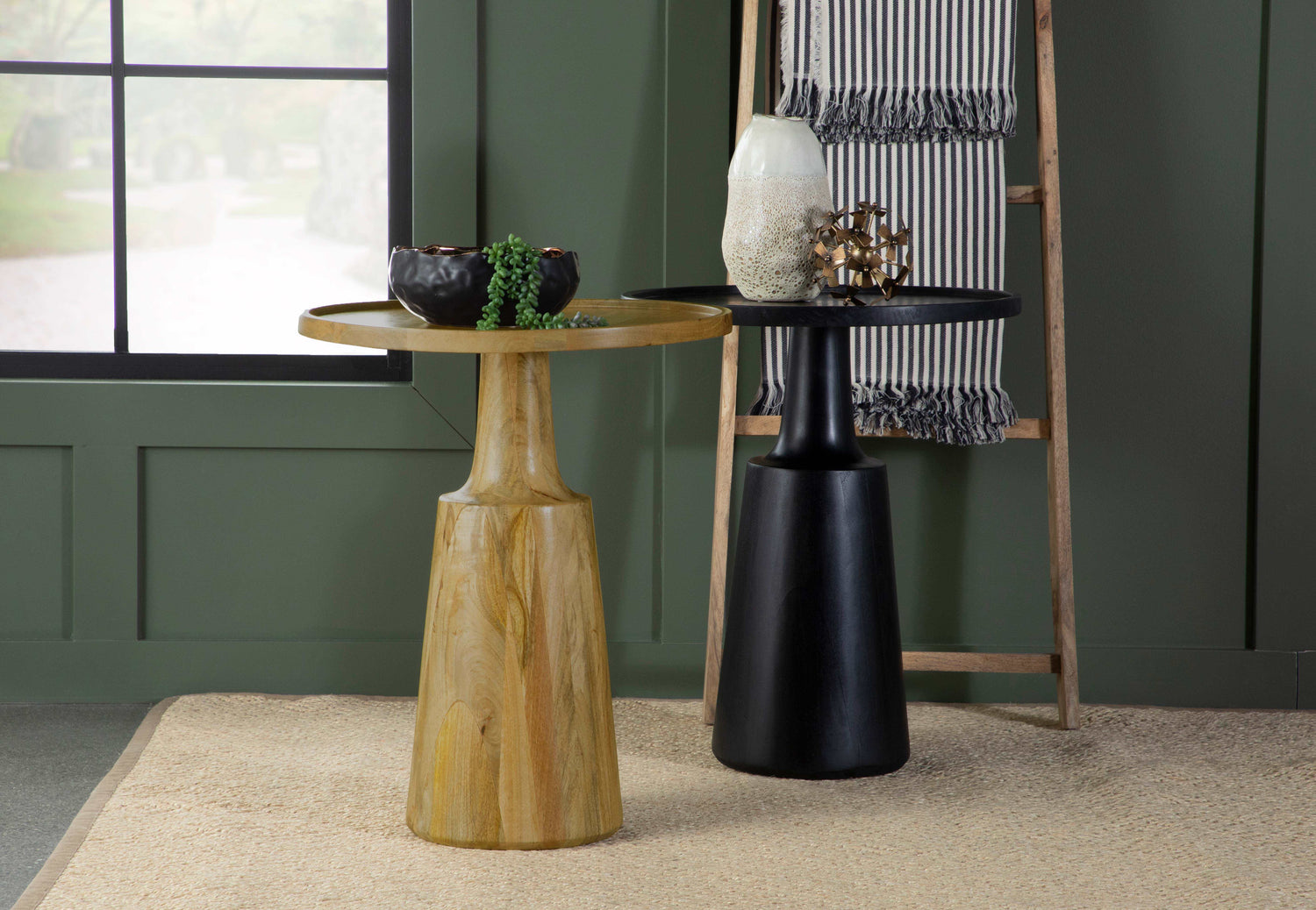 This global-inspired round accent table offers a striking design for any space. An elegant, solid contoured base tapers toward the top that supports a round table surface. Raised edges define the silhouette even further and keep items in place. Made of an eco-friendly mango wood, this accent table rests comfortably beside a small accent chair or acts as a standalone furniture piece to showcase decor. Allow it to hold a small table lamp or collection of family photos.