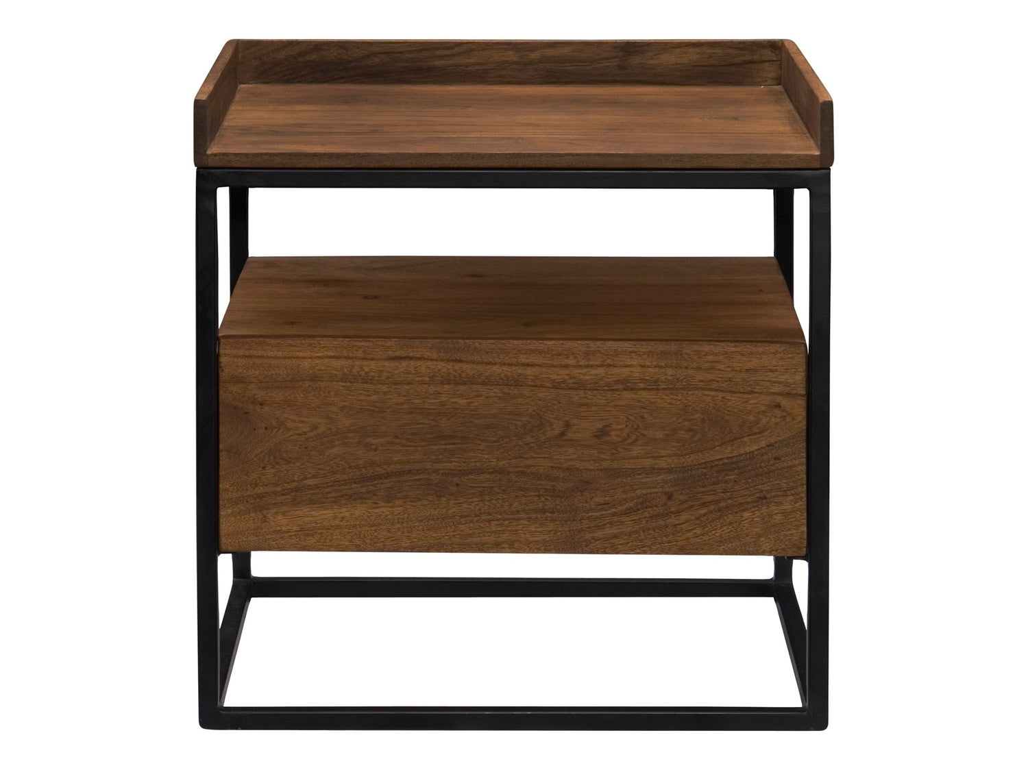 - Solid Acacia wood tray top and single drawer for maximum storage- Powder-coated iron frame