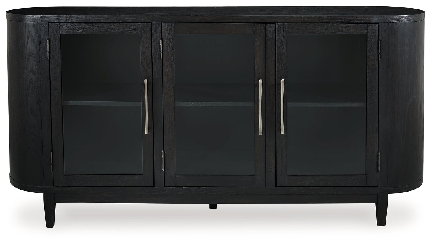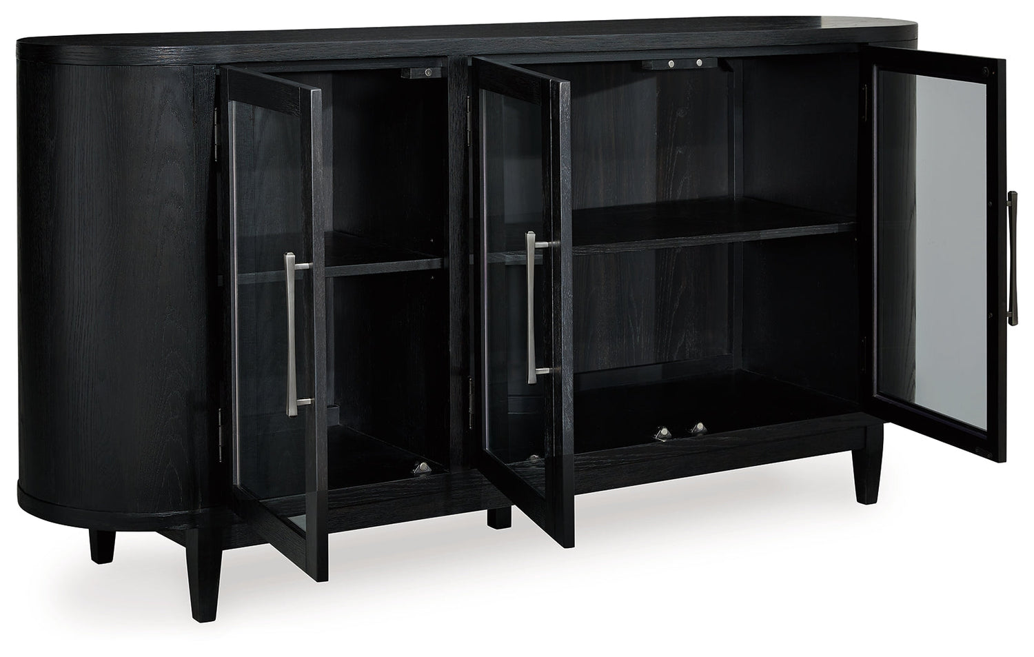 Inspired by art deco design, this dining server makes a lasting impression in a simply stunning way. Its magnificent rounded silhouette is enhanced with a rich layered black finish on the textured wood grain surface. Complete with glass cabinet doors, interior shelving and tapered legs, it’s the contemporary statement piece you’ve been seeking to elevate late-night dinners and full-on family feasts.