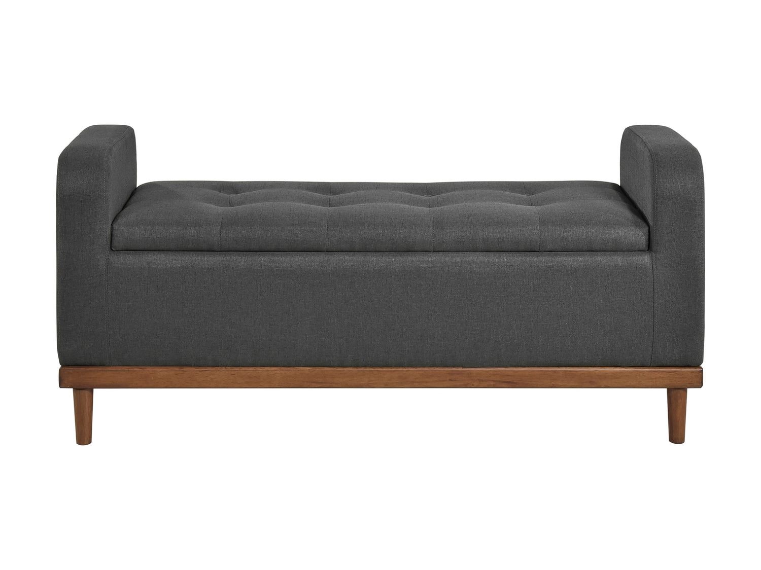 Mid-Century Modern lines define the design of the Brigitte Collection, providing both seating and storage in one functional piece. The accent bench’s interior space creates function beyond the button-tufted lift-top seat, providing the perfect space to store your decorative pillows and blankets. The dark gray textured fabric upholstery that covers the storage ottoman is perfectly complemented by the walnut finish of the solid wood support frame.