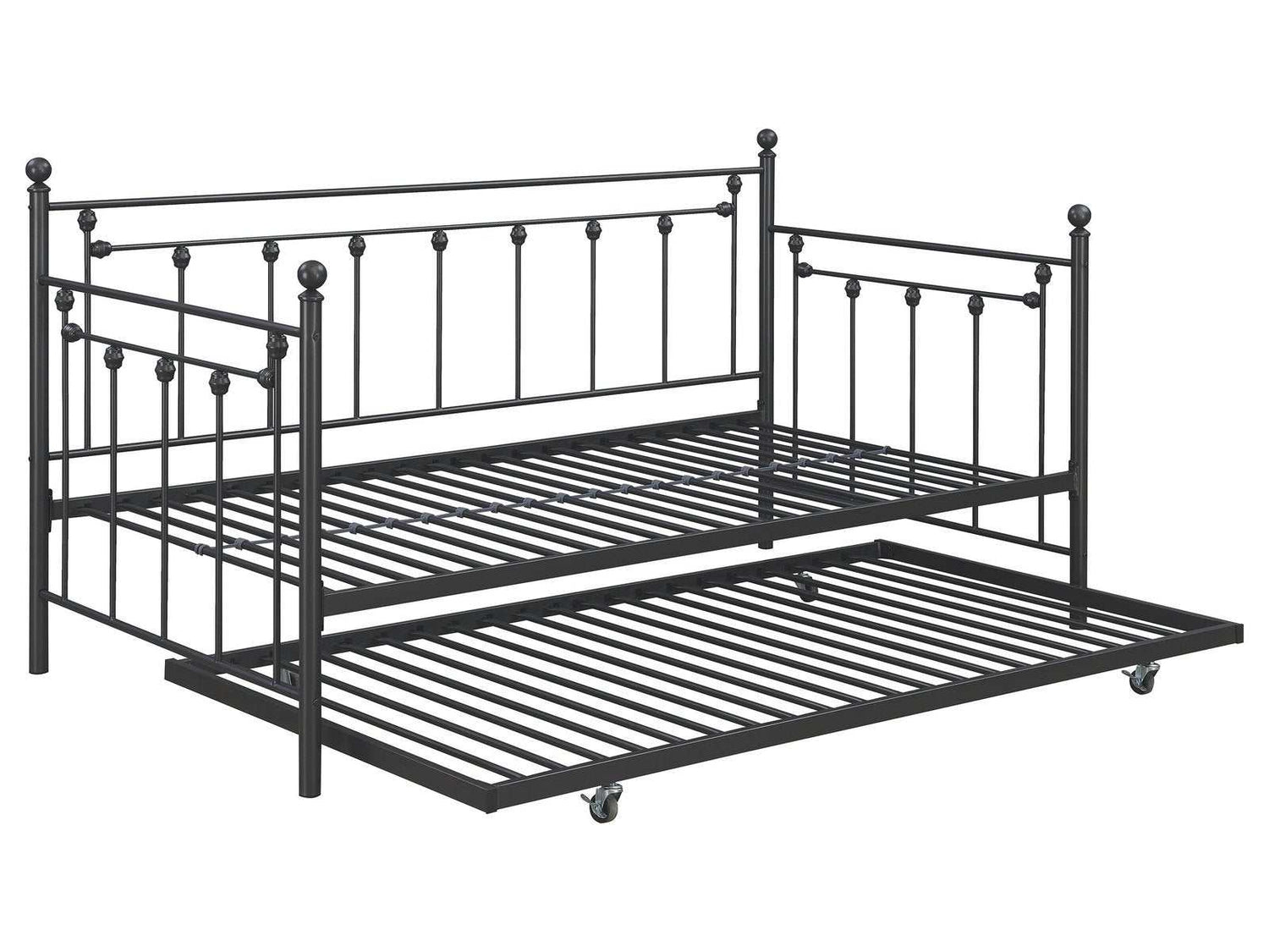This twin size daybed offers a compact furniture piece for smaller bedrooms. Designed in a classic farmhouse style, it offers a charming classic spindle style with modern touches like a powder coated finish. Each spindle is adorned with a round metal finial accent, which adds a lovely traditional touch. Convenient and versatile, this twin daybed also comes with a rolling underbed trundle that can pulled out for overnight company and sleepovers. Smooth gliding casters make it super easy and this bed is available in two finishes so you can choose the color that best matches your existing color palette and style.