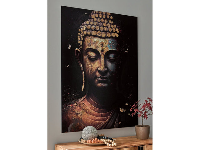 This glass wall art is the perfect addition to a tranquil space. With muted, calming shades of black, teal, rust and gold, this contemporary take on the meditating Buddha instills instant serenity in your home.