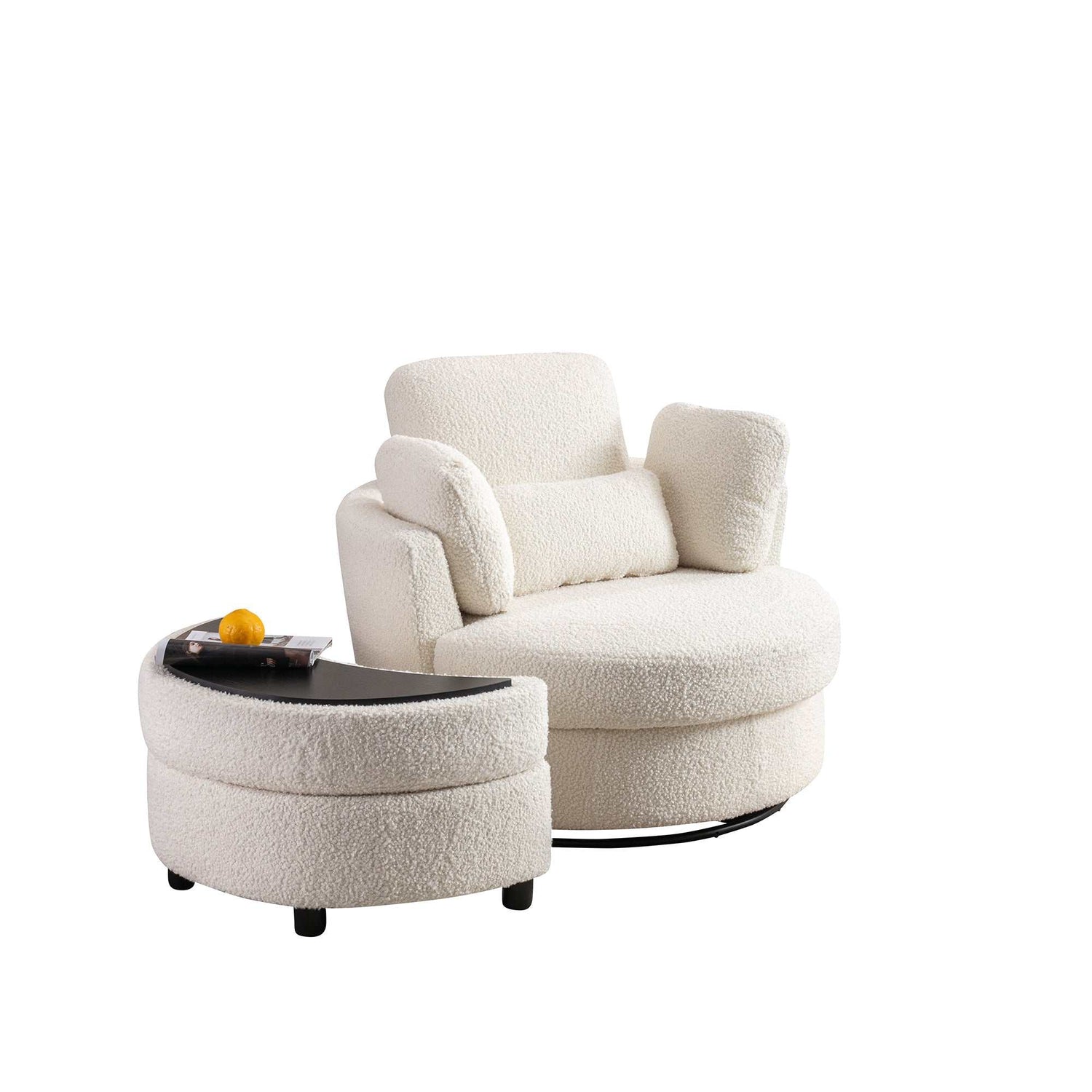 Elevate your living space with this exquisite combo. The swivel accent barrel chair offers a comfortable and stylish seating option, while the crescent moon storage bench doubles as a functional ottoman, providing both extra seating and convenient storage space.