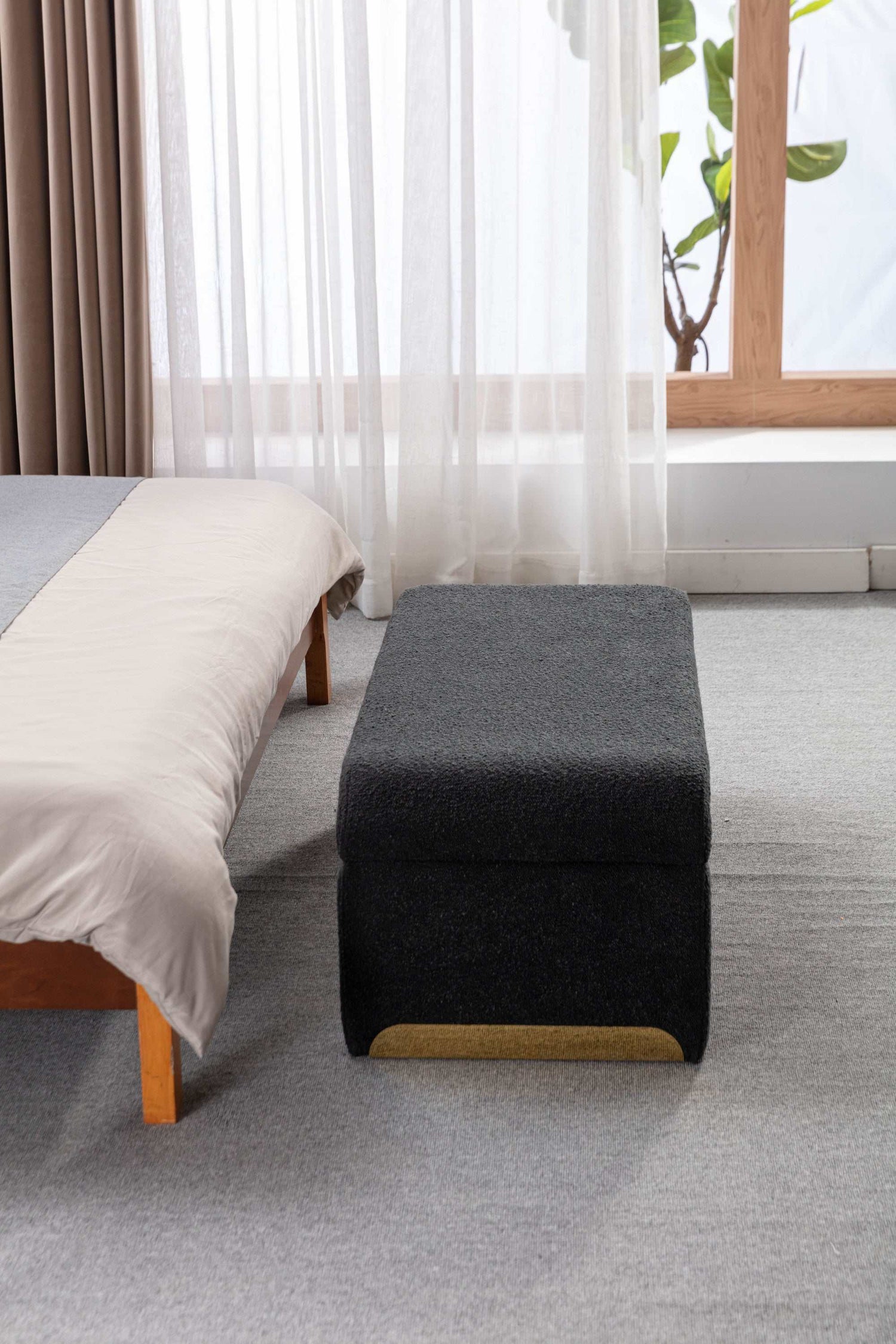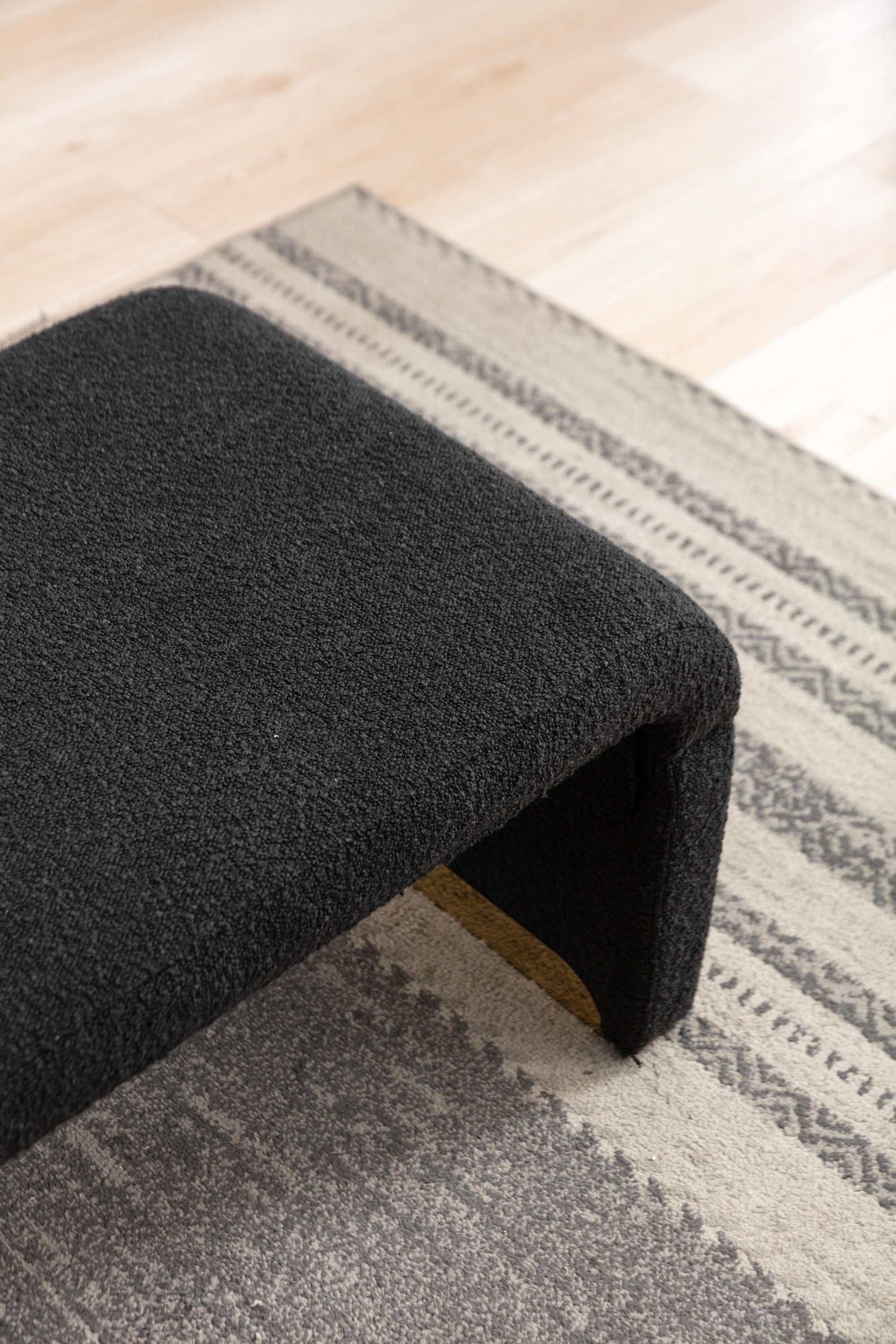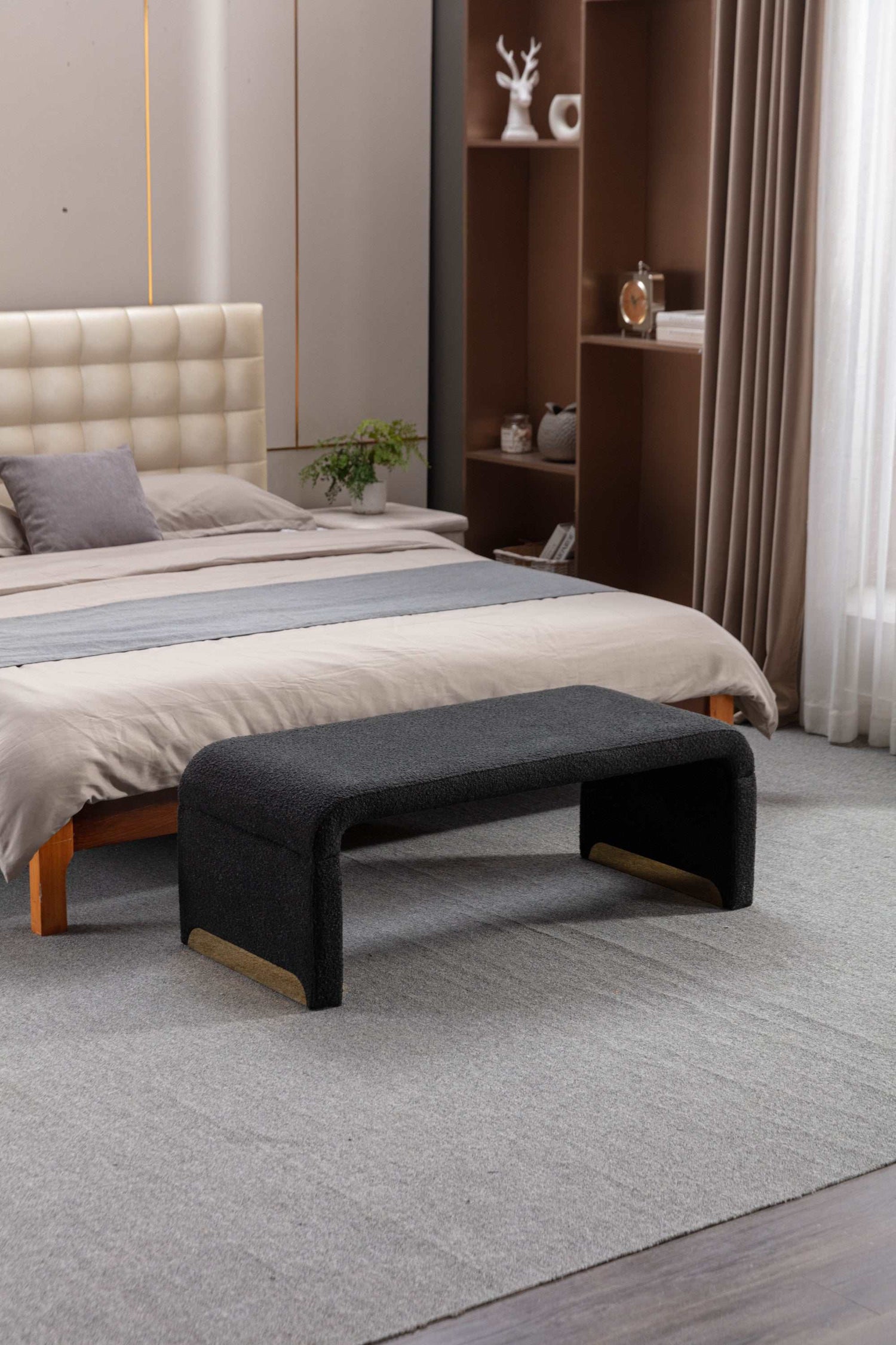 Introducing our New Boucle Fabric Loveseat Ottoman, a chic and versatile addition to your bedroom. Upholstered in a delightful combination of black, this bench is designed to elevate your space with a touch of luxury.