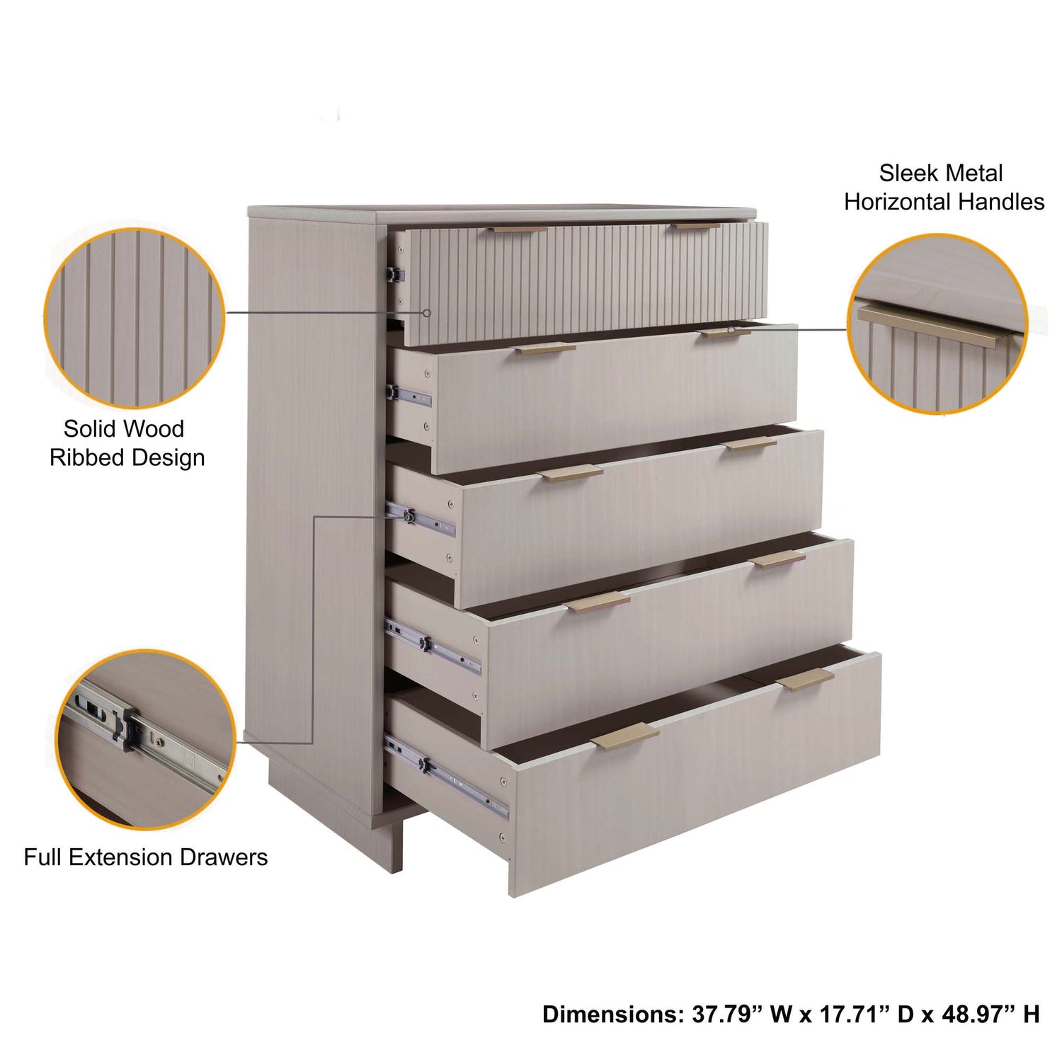 - Includes Full Extension Drawers with Top Drawer Designed in Vertical Textured Ribbed Lines Made from Solid Wood.
