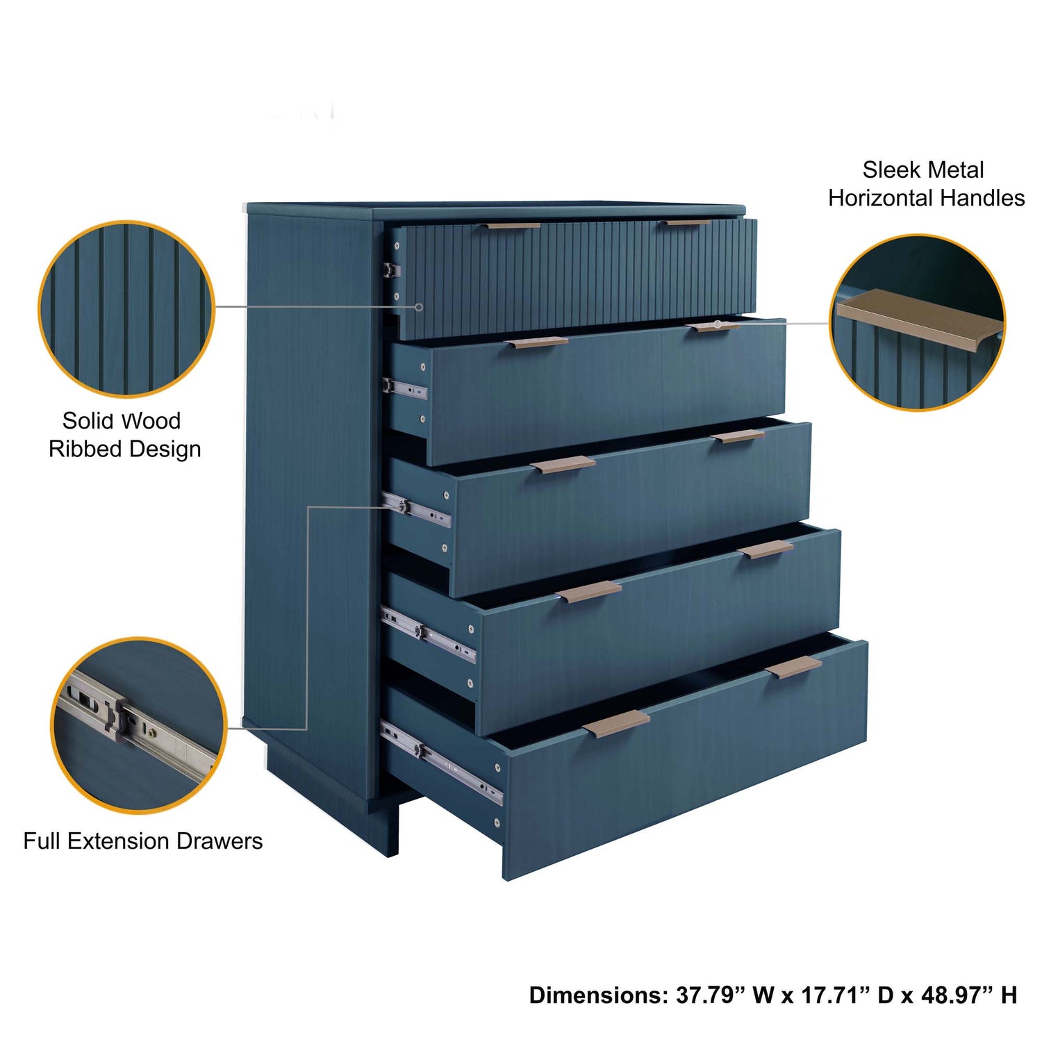 - Includes Full Extension Drawers with Top Drawer Designed in Vertical Textured Ribbed Lines Made from Solid Wood.
