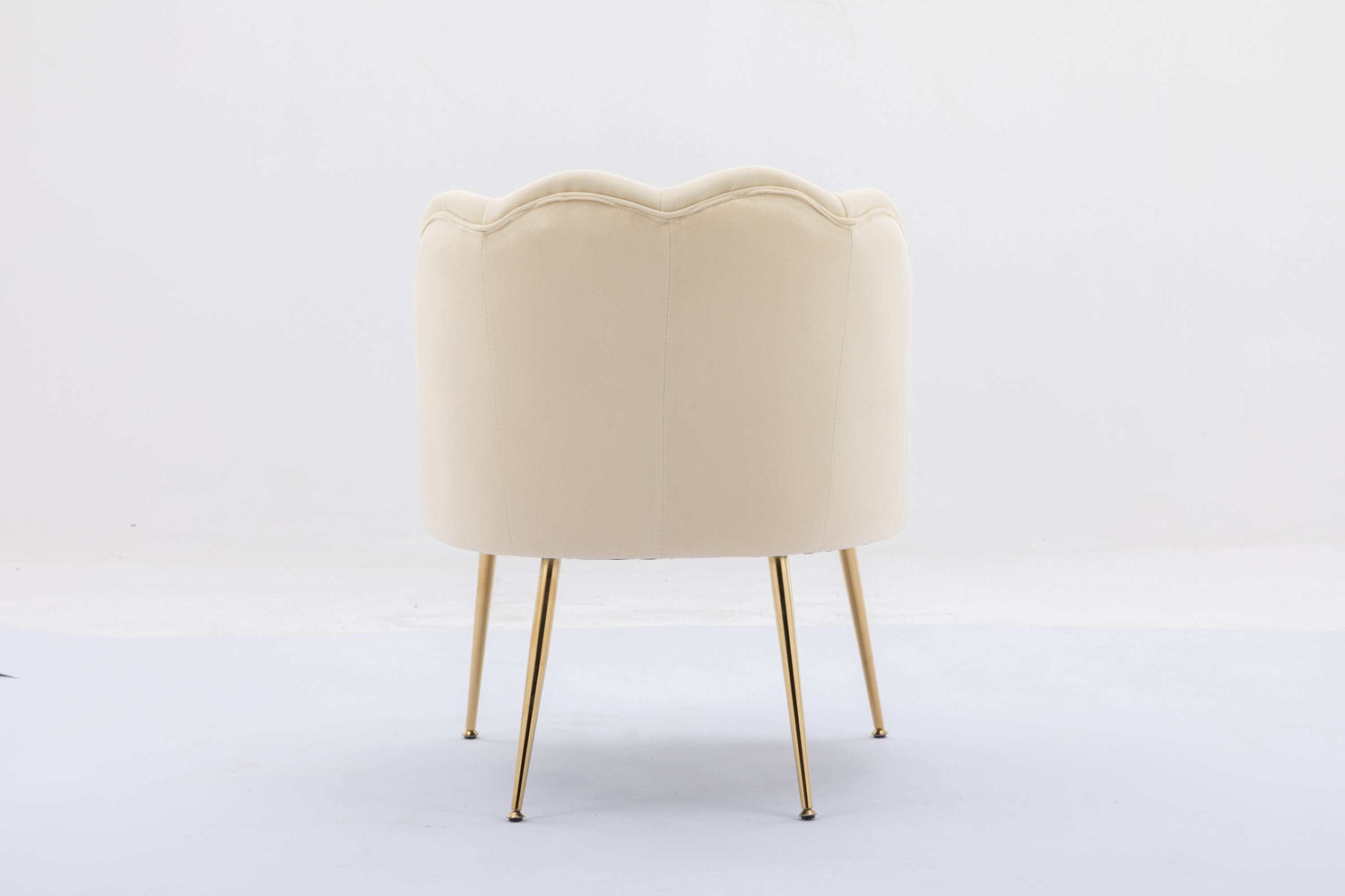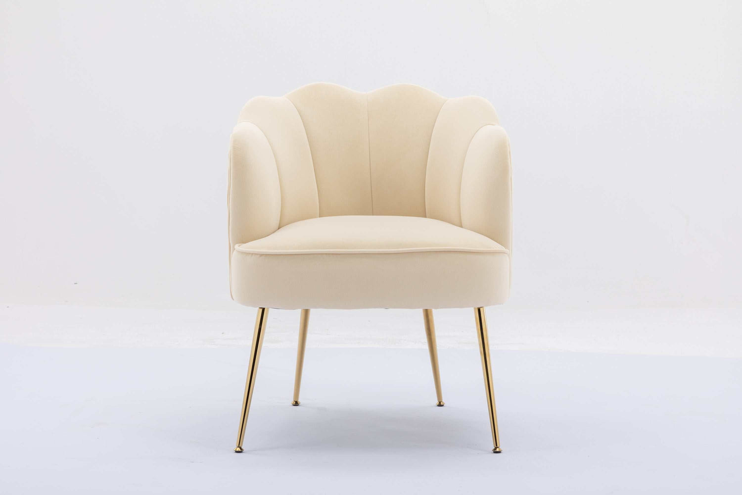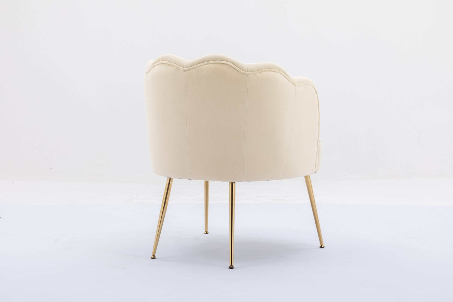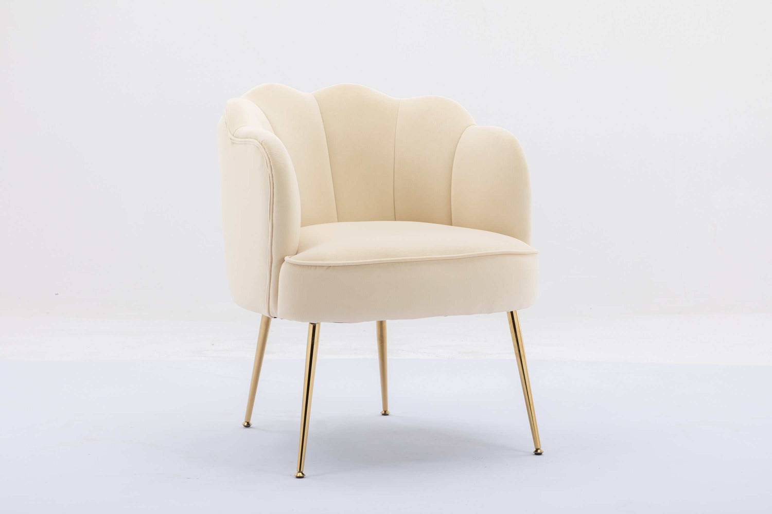 Meet our Shell-Shaped Armchair, a perfect blend of comfort and mid-century style. Wrapped in a soft crème white fabric, it's an invitation to relaxation. The elegant gold legs add a touch of sophistication, making it a versatile addition to any living room or bedroom.