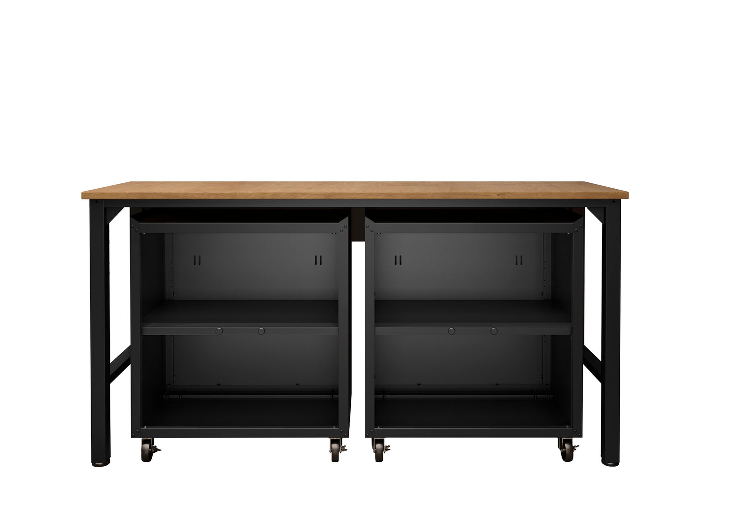 - Includes 2 Mobile Garage Cabinets and 1 Worktable with Tuck-In Features.