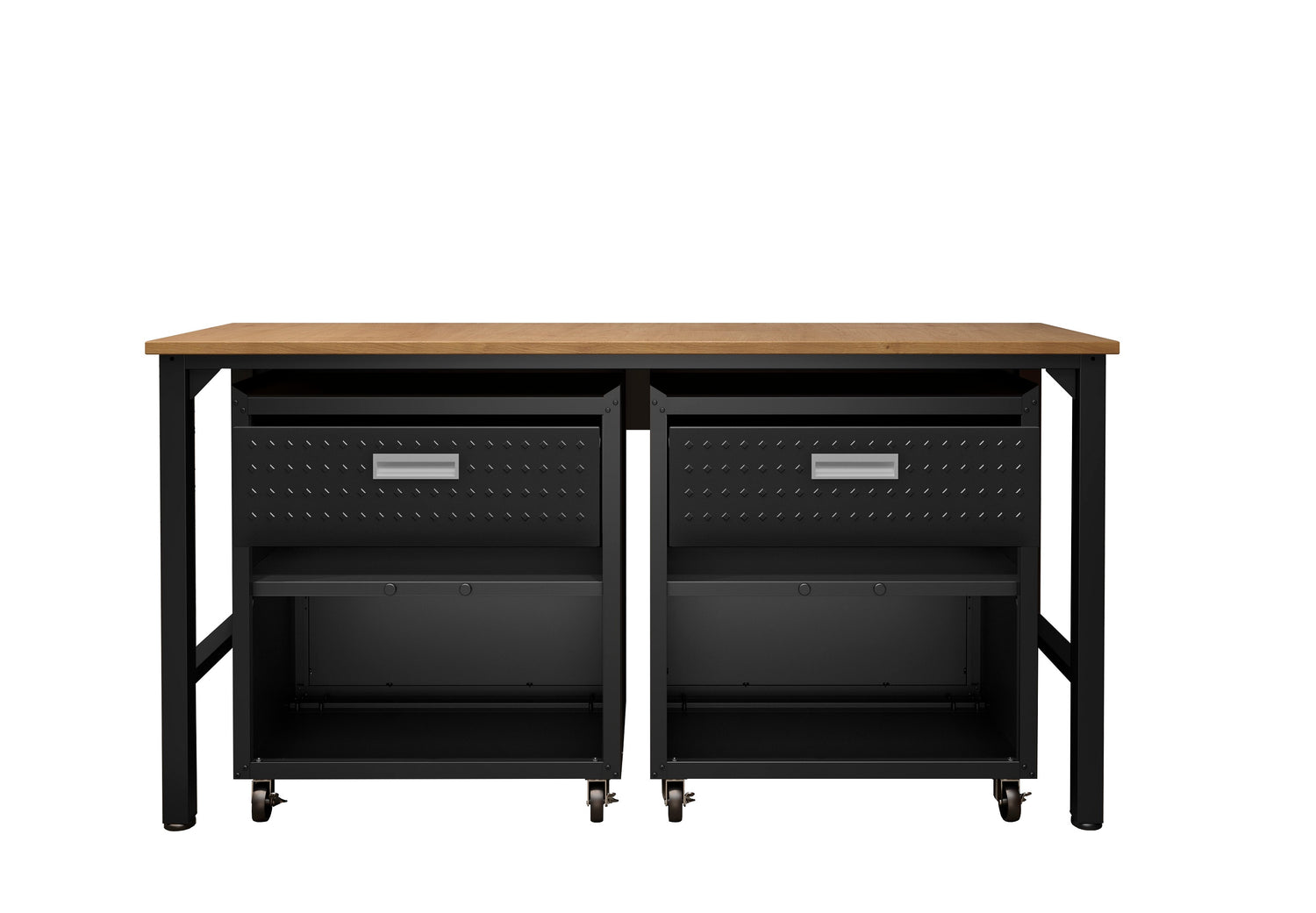 - Includes 2 Mobile Garage Cabinets with 1 Full Extension Drawer, and 2 Doors with 1 Adjustable Shelf, and 1 Worktable.