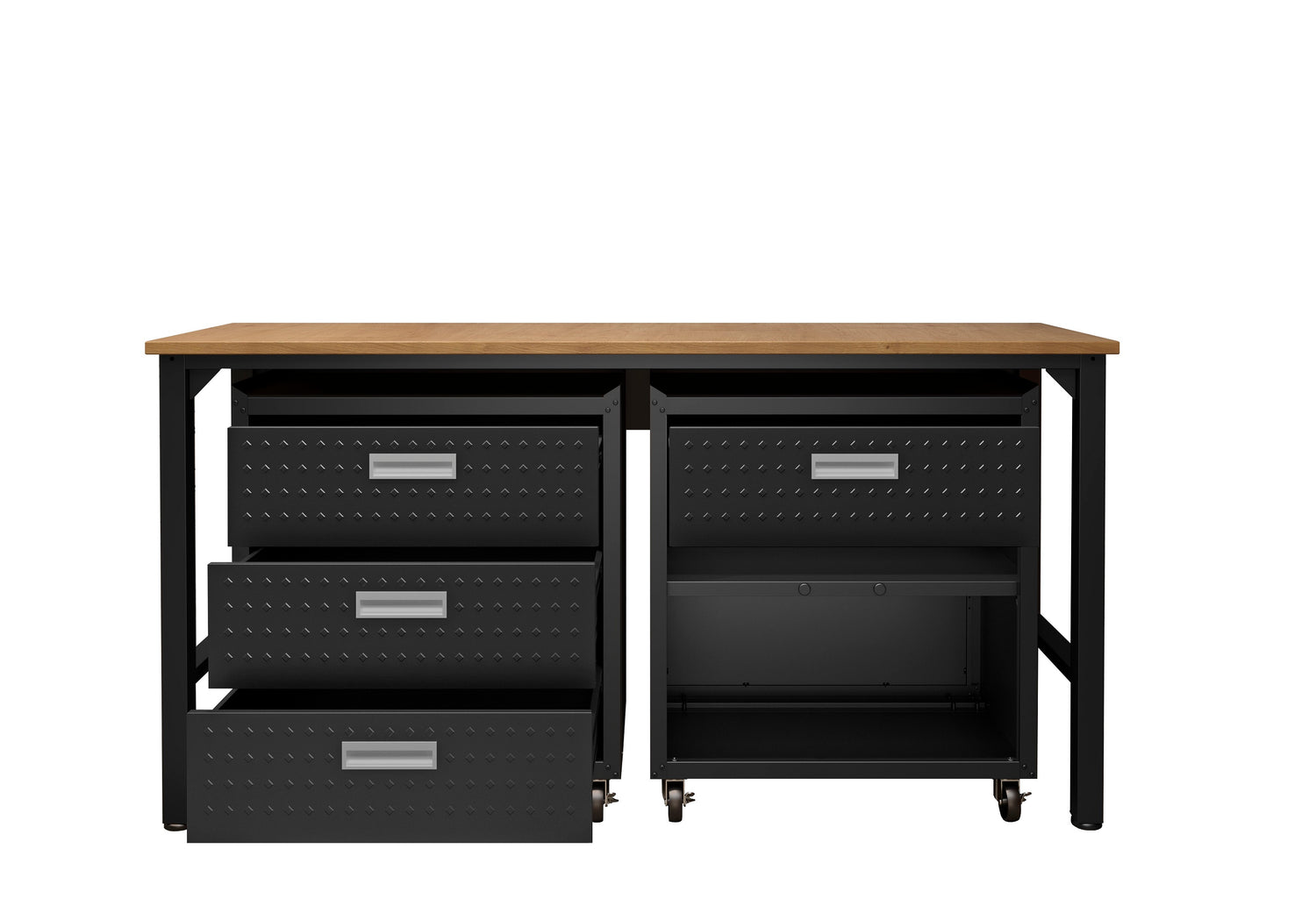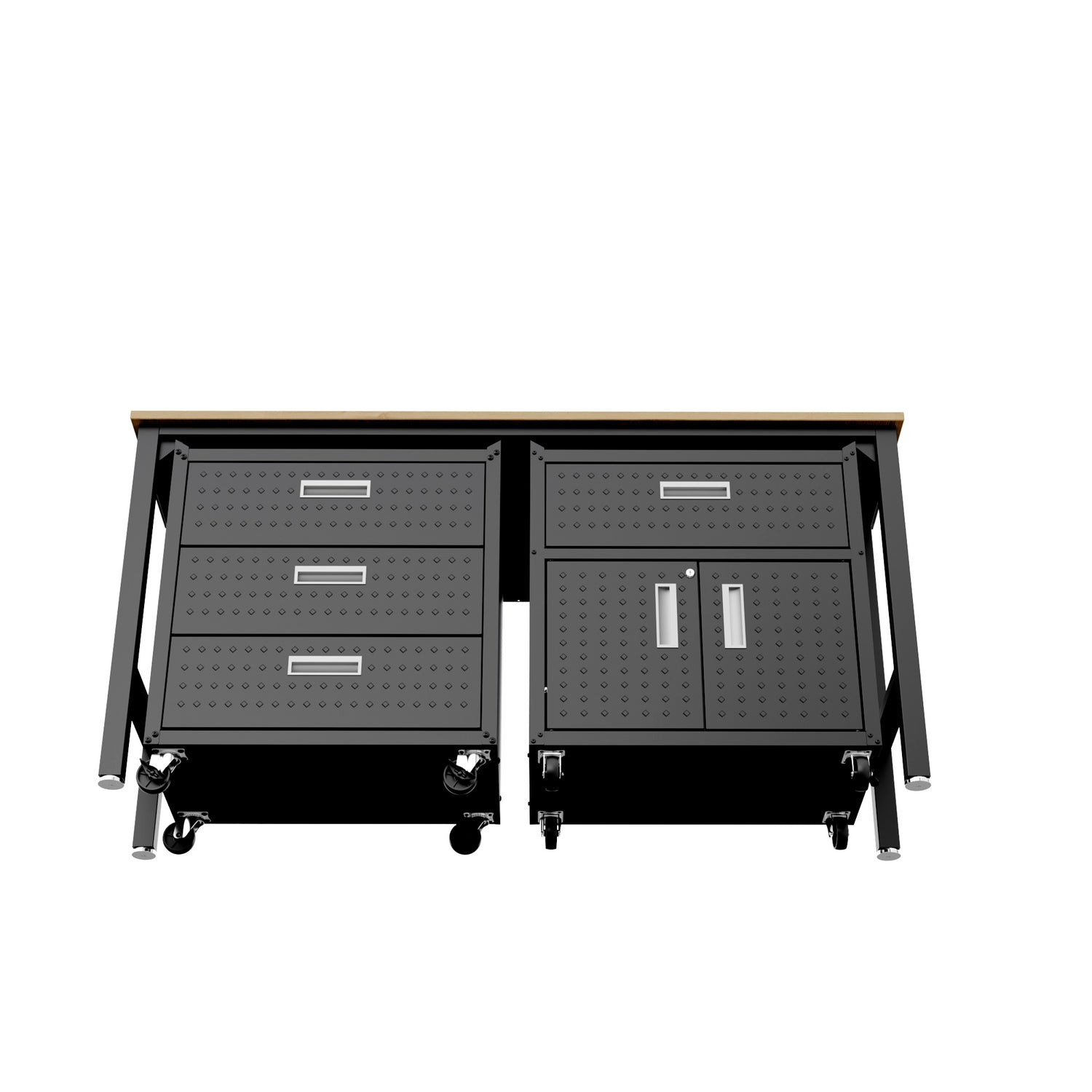- Includes 1 Mobile Garage Chest with 3 Full Extension Drawers, 1 Garage Cabinet with 1 Adjustable Shelf and Full Extension Drawers, and 1 Worktable.